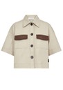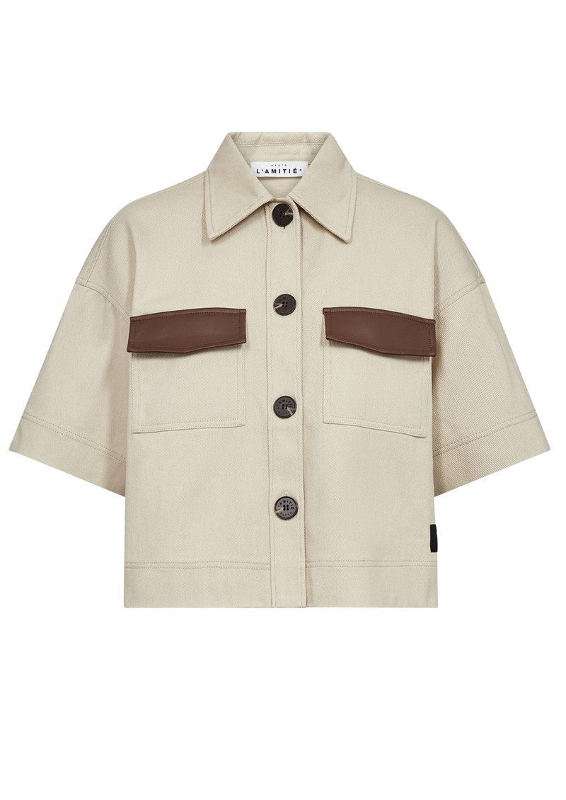 Introducing the Haute L'Amitie Bowie Crop Pocket Shirt, designed in a thick cotton sand fabrication. This cropped short sleeve shirt, features a collar, button down front and faux brown leather patch pockets on the front. Other features include:
