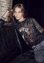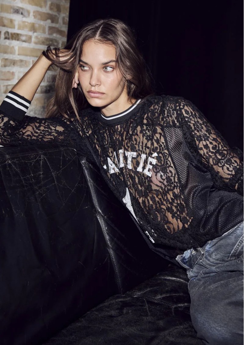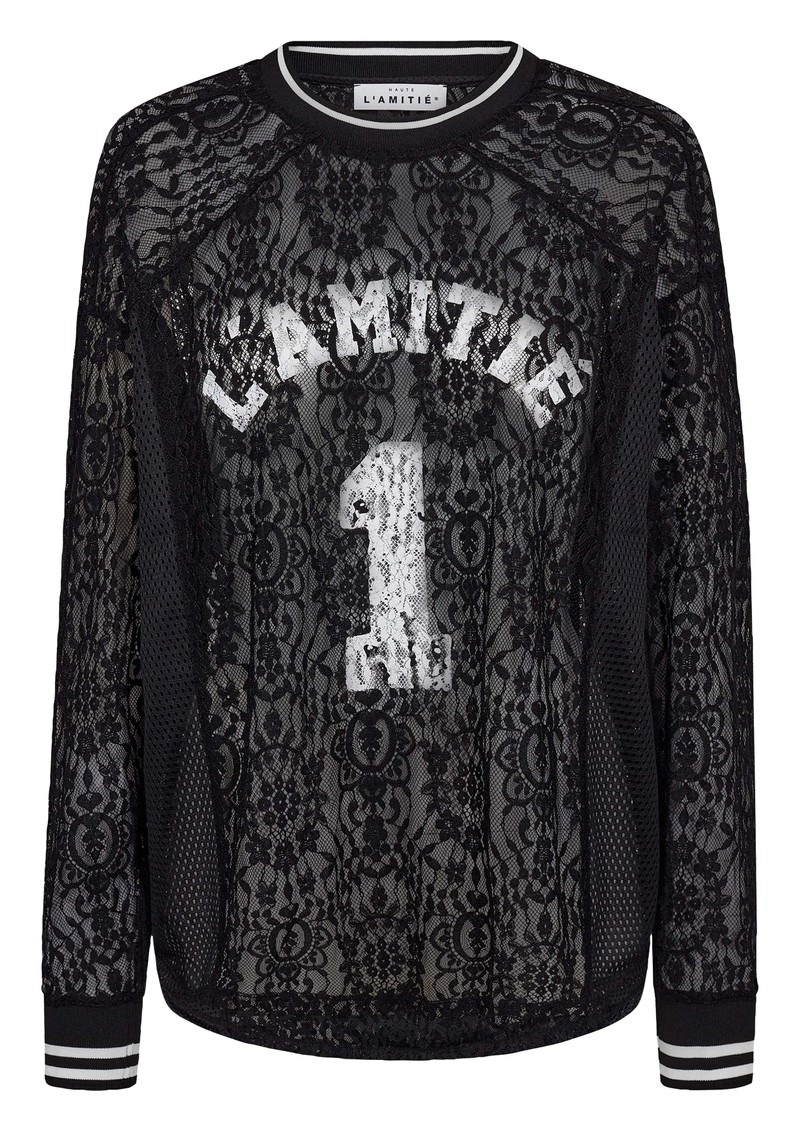Sporty inspired, meet the new Haute L'Amitie Lace Long Sleeve Football Top in Black. Featuring an all over lace design, this relaxed shape top also features a sporty motif on the front and striped neckline. Other features include: