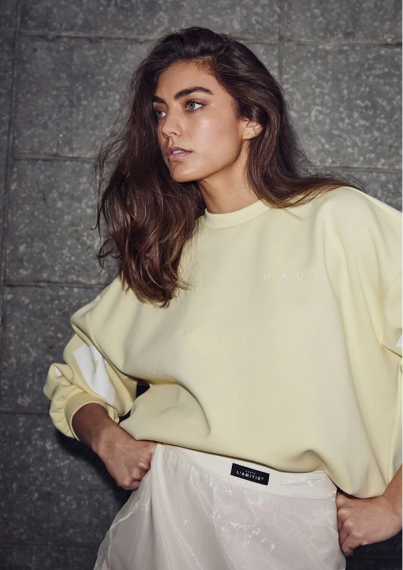 Introducing the Maxi Split Logo Sweatshirt from Haute L'Amitie, designed in a Candy Floss Pink and detailed with large white lettering and branding across the front and sleeves. This oversized fit sweater also features: