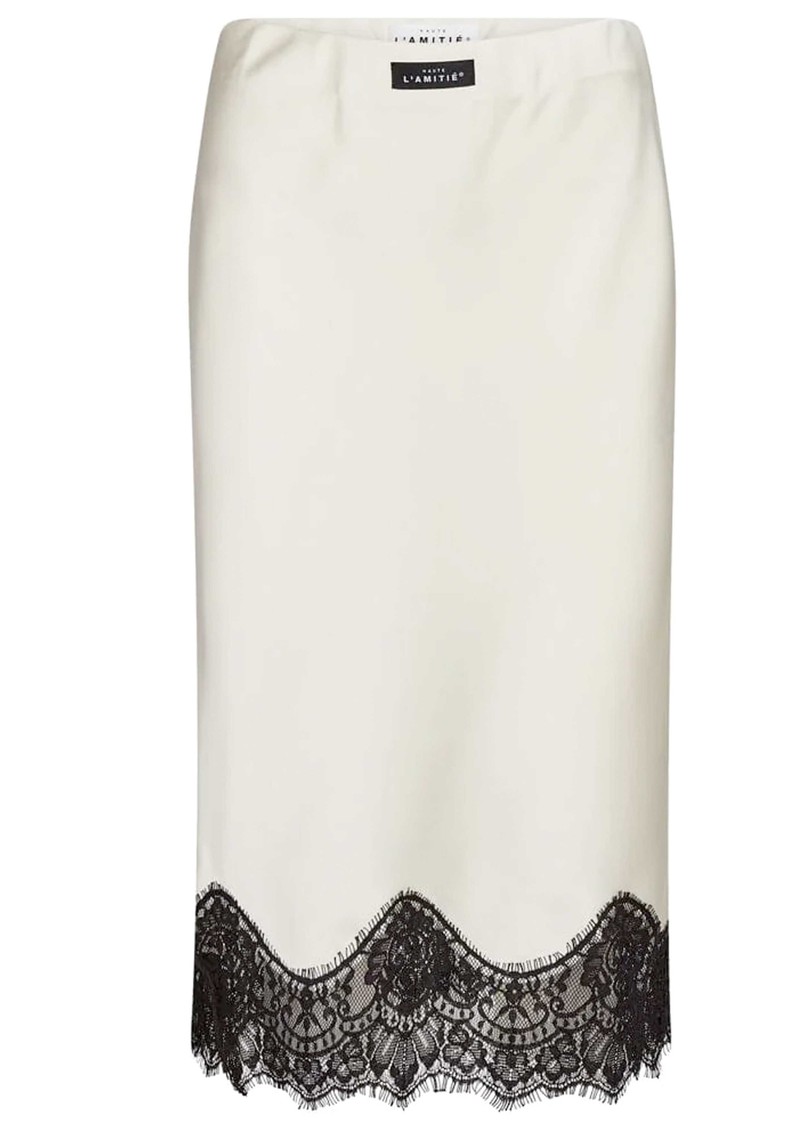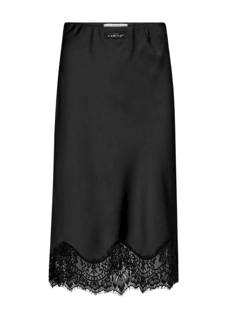 The Naomi Lingerie Pencil Skirt from Haute L’Amitie in black is a strikingly elegant piece, combining sleek tailoring with delicate feminine details. Featuring a narrow, fitted silhouette, an elasticated waistband with logo detail, and subtle lace trim at the hem, it’s perfect for effortlessly dressing up or down for any occasion.