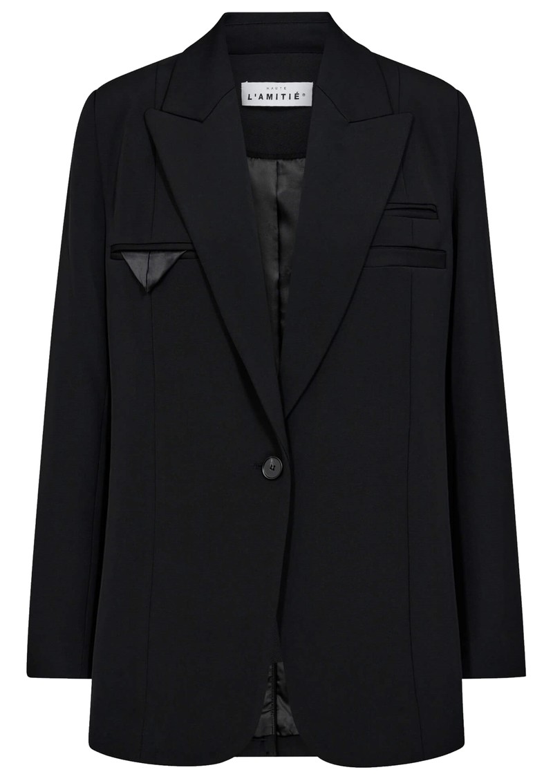 The Haute Lamitie Premiere Single Blazer is a striking tuxedo style perfect for the new season.Crafted in a polyester blend- this black blazer features a classic tuxedo style pointed collar with softly padded shoulders for a flattering shape and single breasted button closure. This blazer also features faux pocket detailing across the chest. Other key features include: