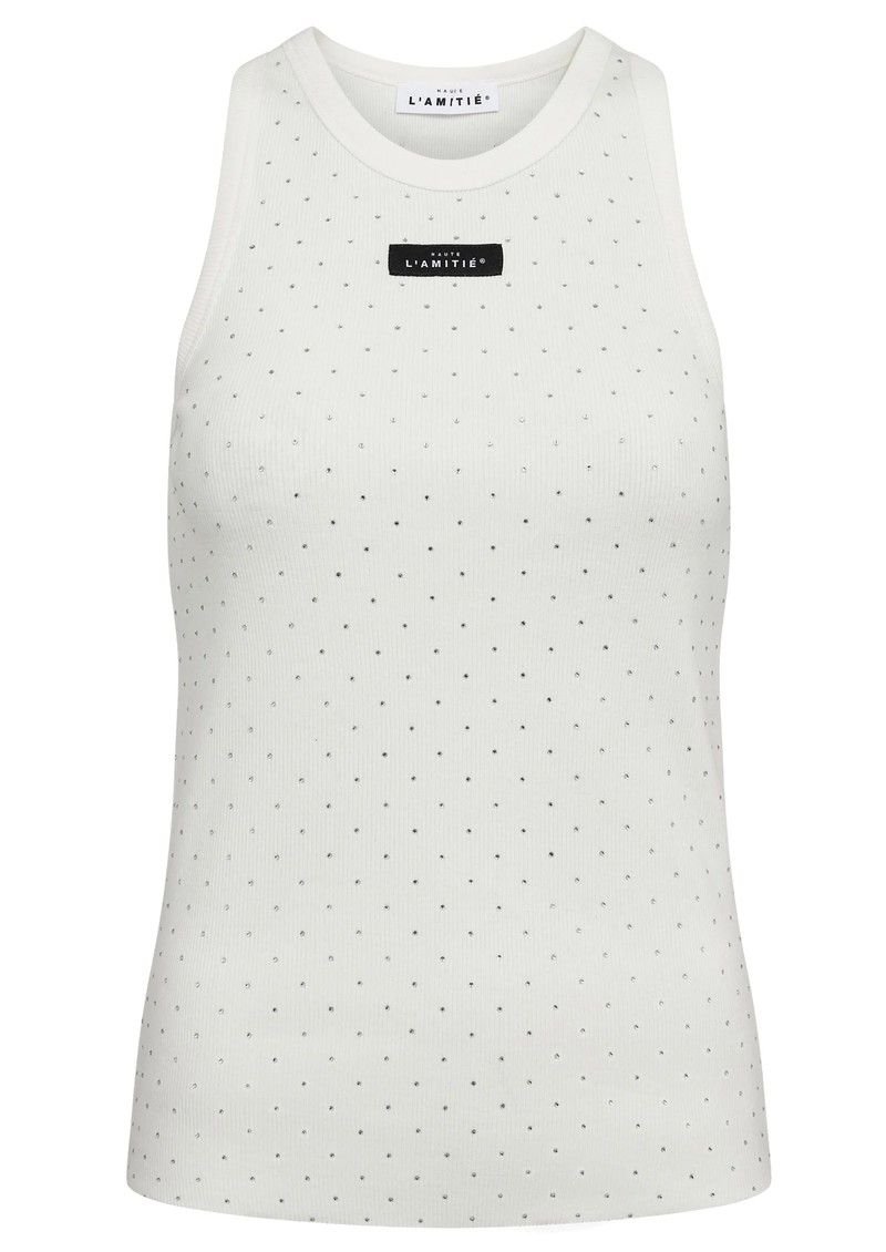 Introducing the Haute L'Amitie Rib Badge Stone Tank in Off White. Decorated in silver tone rhinestones all over, this ribbed tank also features a branded logo badge, giving it that cool element. Other features include: