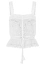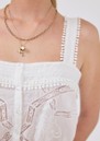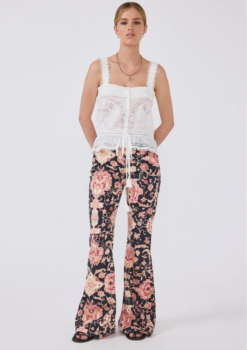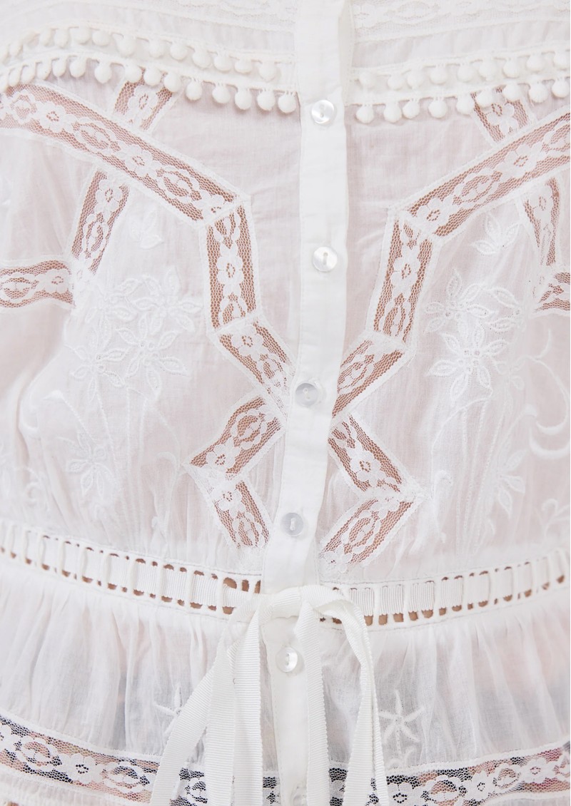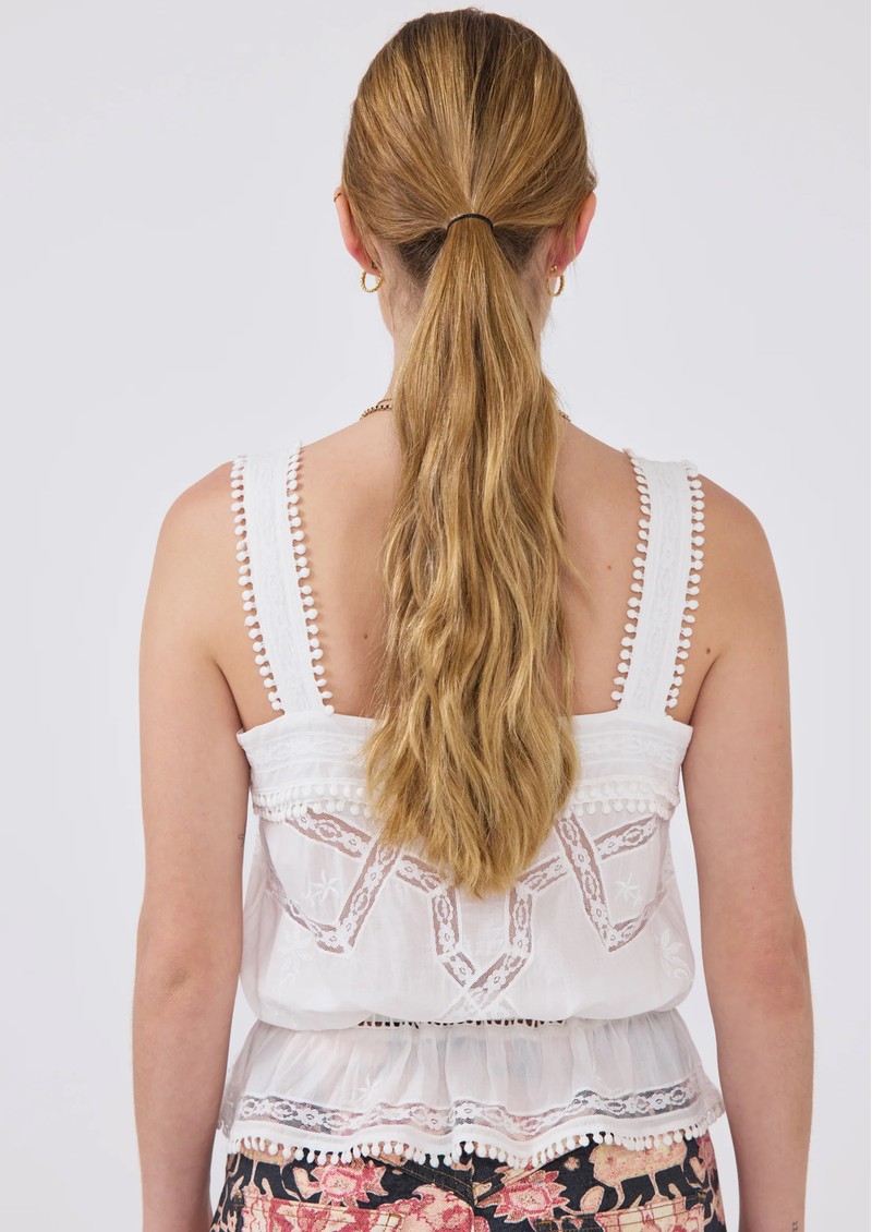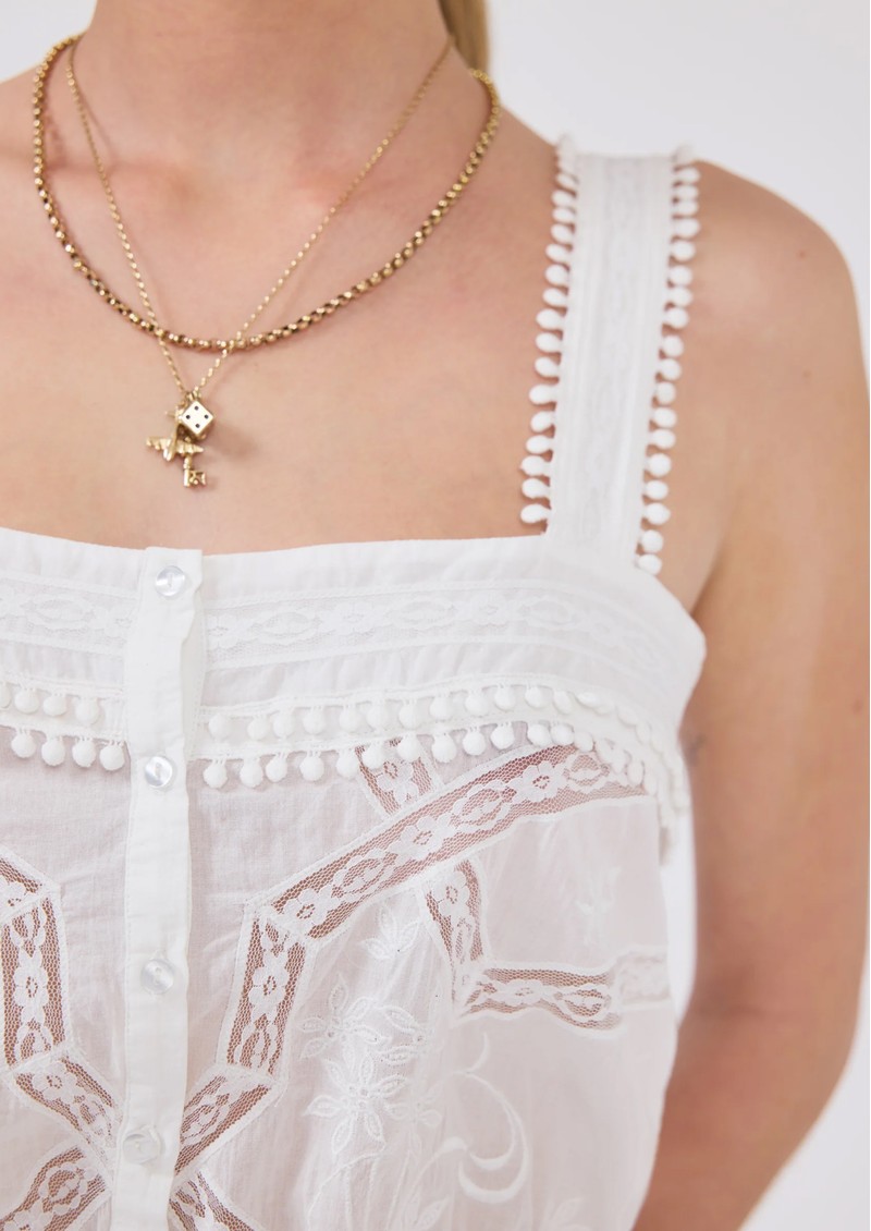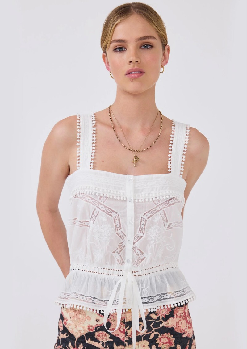 The Hayley Menzies Gene Cami in white is a beautifully crafted cotton piece with a square neckline, wide straps and a softly structured shape, brought to life with delicate lace inserts, intricate embroidery and playful pom pom trims for a romantic, vintage-inspired feel. Finished with a tassel tie waist to cinch or wear loose, its lightweight, airy design makes it an effortless summer staple.