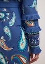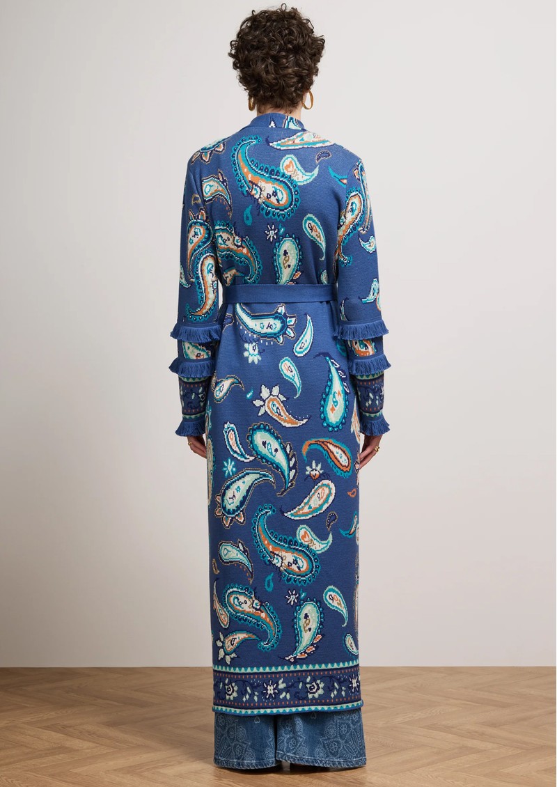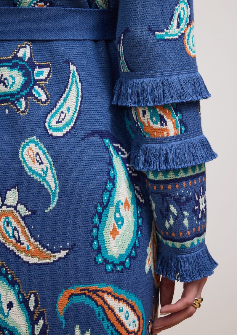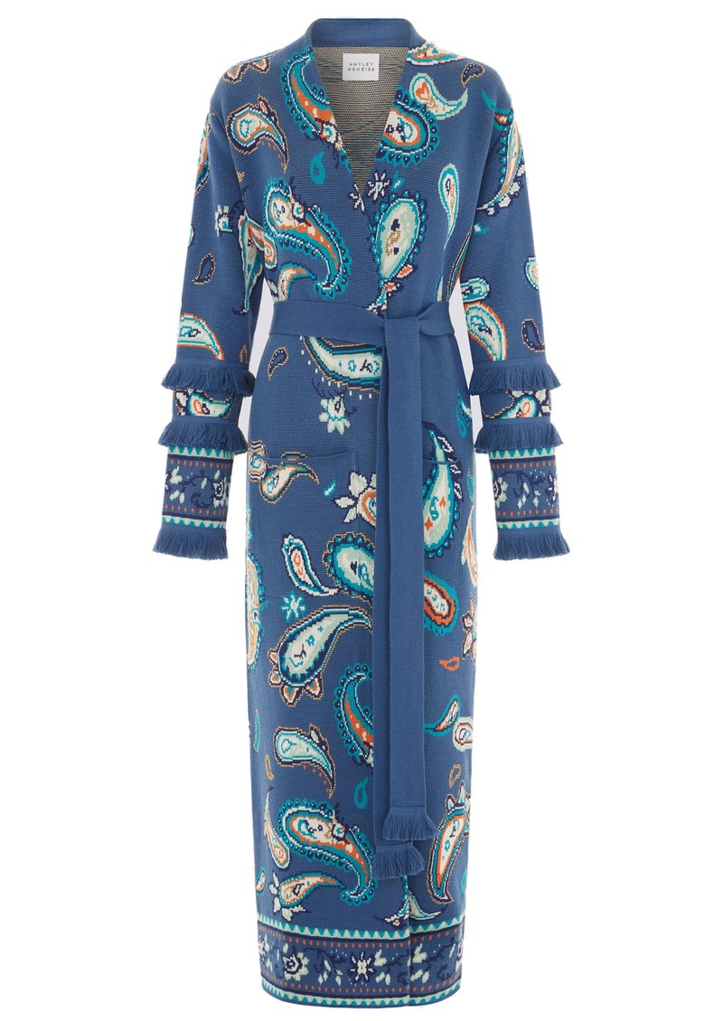 Introducing the stunning Jimi Duster Cardigan from Hayley Menzies in Blue. This maxi length duster features a beautiful paisley print with ornate borders and fringe detailing on the sleeves. This bohemian inspired cardigan also features: