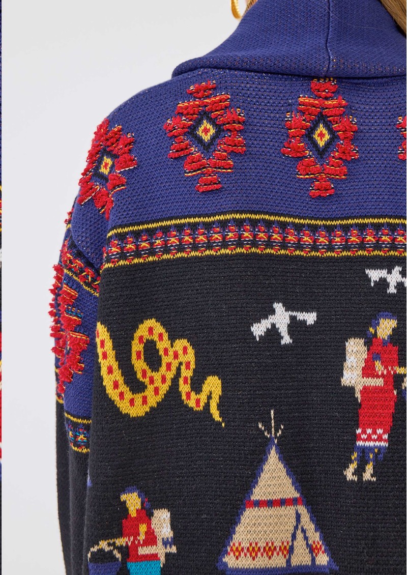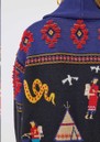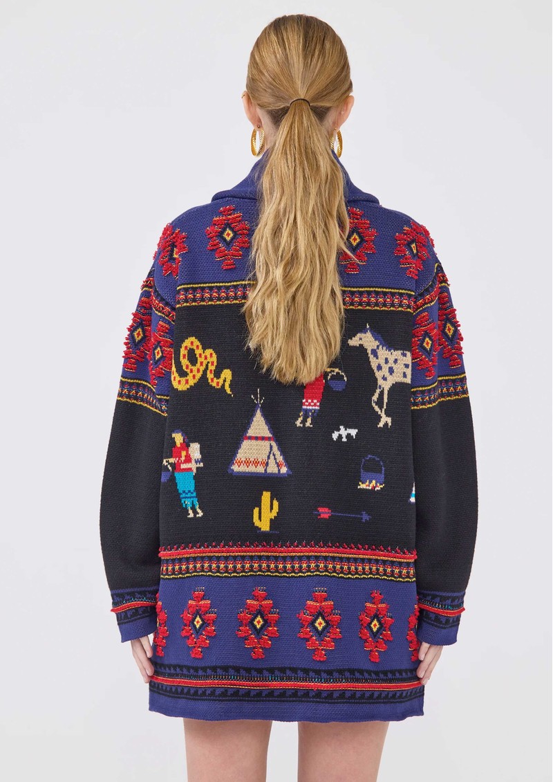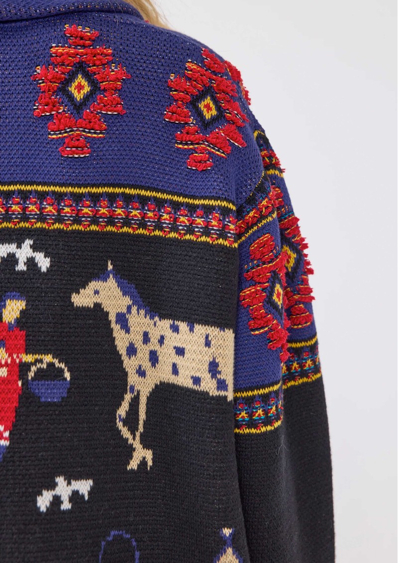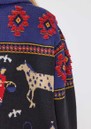 Bring drama to cold-weather dressing with Hayley Menzies’ Nomadic Tapestry Cardigan, inspired by a vintage knit discovered on Portobello Road. This statement coatigan reimagines a desert scene in a rich 7-colour jacquard, with 3D tufted horses, snakes and fireside motifs, finished with heirloom horn buttons for timeless appeal.