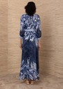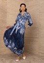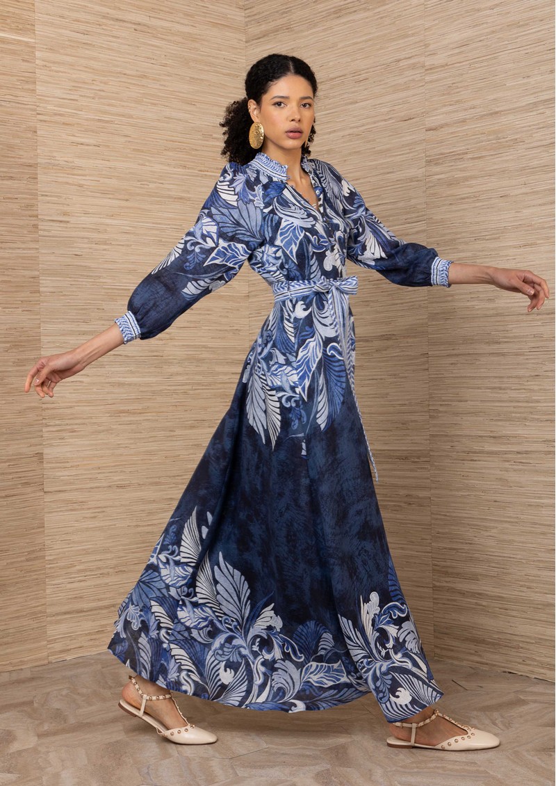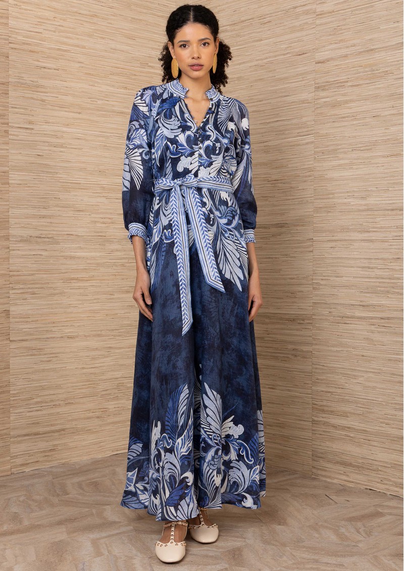 The Halebob Maxi Dress in navy hues features an all-over abstract print, a short shirred collar, and a central button closure. Designed with long sleeves with shirred wrist cuffs, a self-tie belt, and a lightweight, flowy maxi-length silhouette, it’s perfect for effortless, elegant style.
