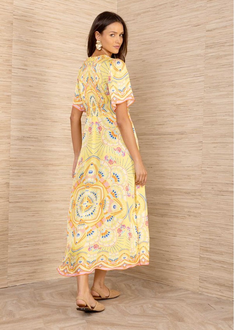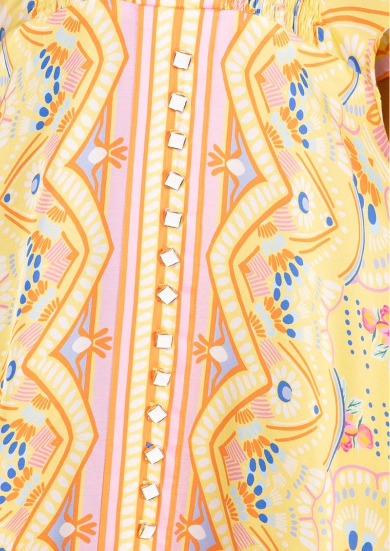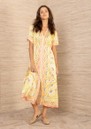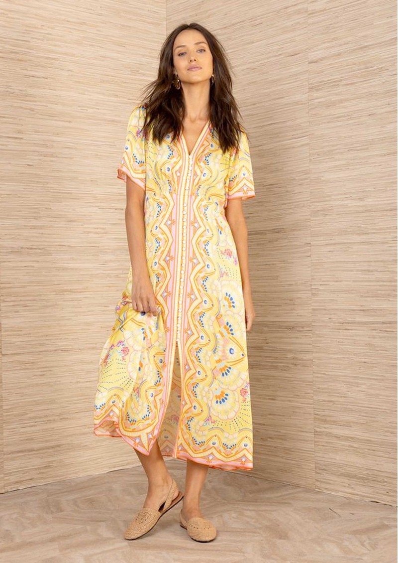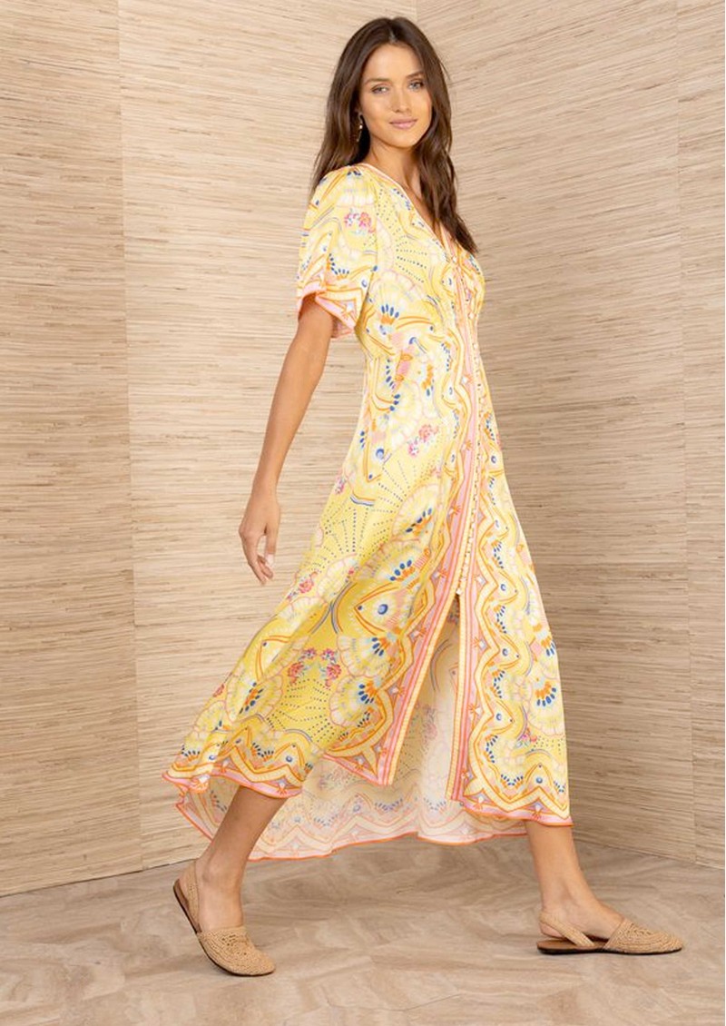 The HaleBob button-down midaxi dress in yellow features a vibrant abstract geo print throughout, cut in a flattering midaxi length for an effortlessly elegant silhouette. Designed with a V-neckline, short sleeves and a full button-down front, it’s finished with a modest central front slit for ease of movement and a subtle touch of allure.