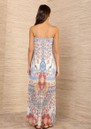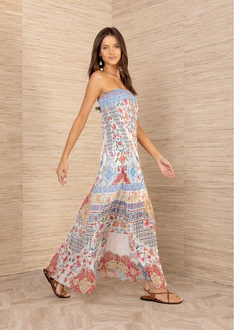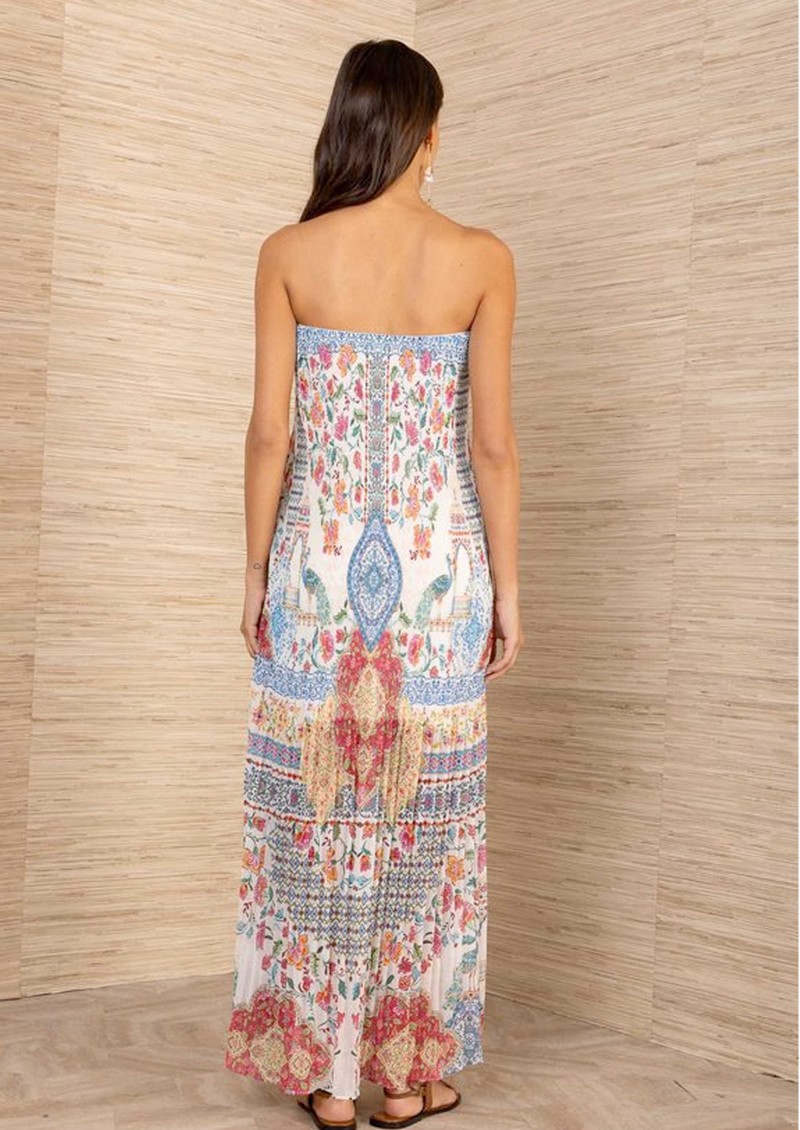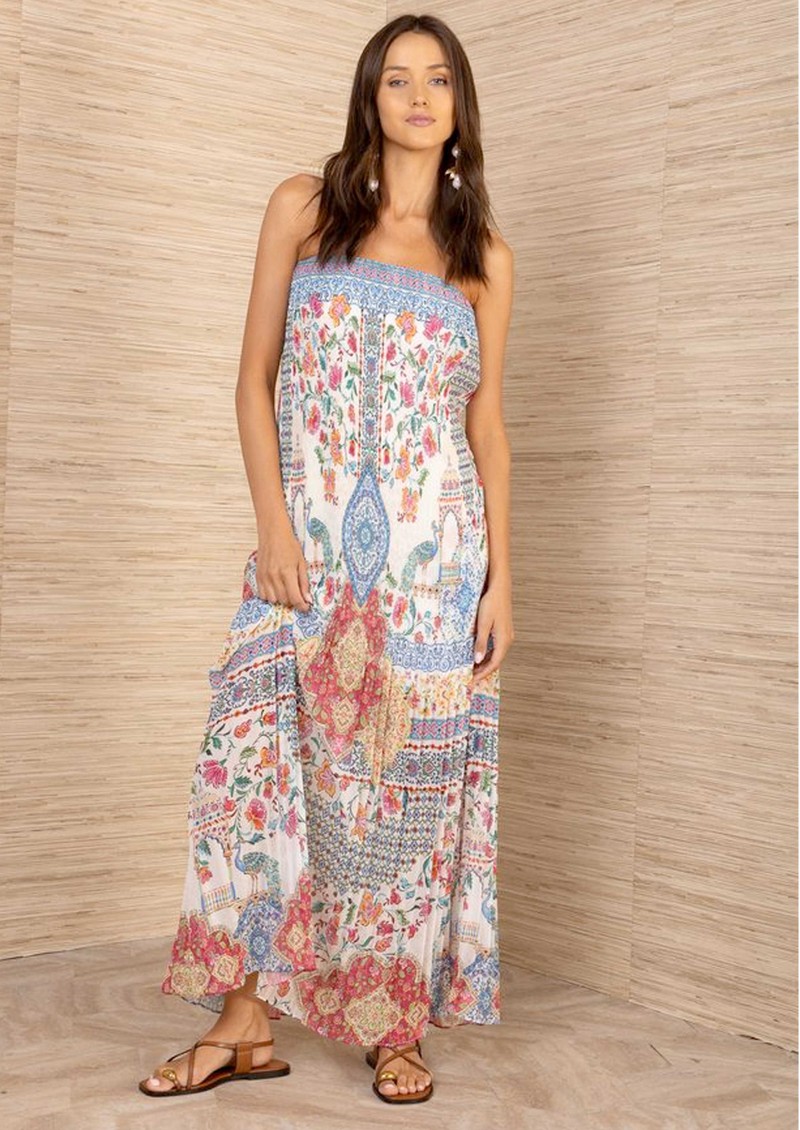 The HaleBob crinkle floral dress features an ivory base brought to life with a vibrant all-over floral print for a fresh, eye-catching finish. Designed in a textured crinkle fabric with a sleek strapless column silhouette and flowing maxi length, it offers an effortless blend of simplicity and statement detail.