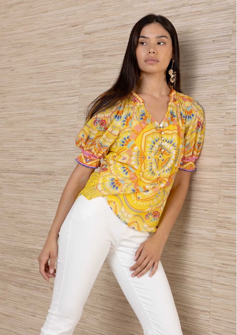 The HaleBob kaleidoscope print blouse in yellow features a lightweight, airy silhouette with an all-over vibrant print for a bold, eye-catching finish. Designed with a short frilled collar, V-opening with central button detailing and voluminous short sleeves finished with frill edges, it brings a playful yet polished feel to an everyday statement piece.
