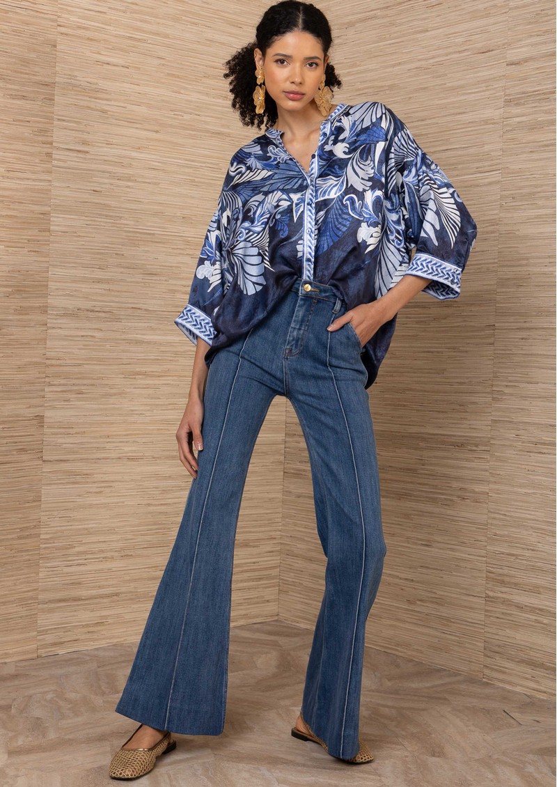 The Halebob oversized blouse features an all-over large-scale print in navy hues, with a central button closure and long, wide sleeves. Its loose, flowing silhouette creates a relaxed, effortlessly elegant look.