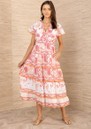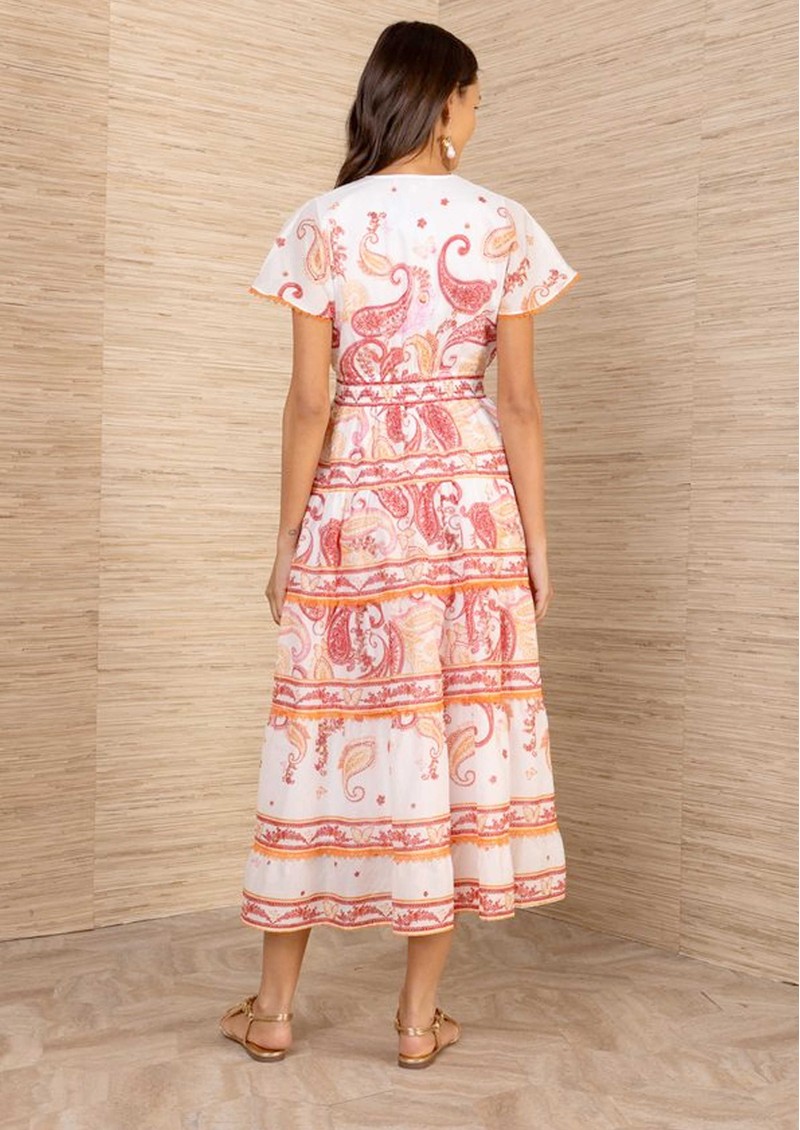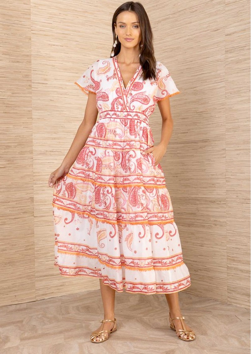 The HaleBob paisley tiered dress in pink features an all-over paisley print on a soft base, designed with a flattering V-neckline and short sleeves finished with delicate embroidered edges. A defined shirred waist creates shape through the bodice, flowing into a tiered A-line midi skirt for an effortlessly feminine silhouette with beautiful movement.