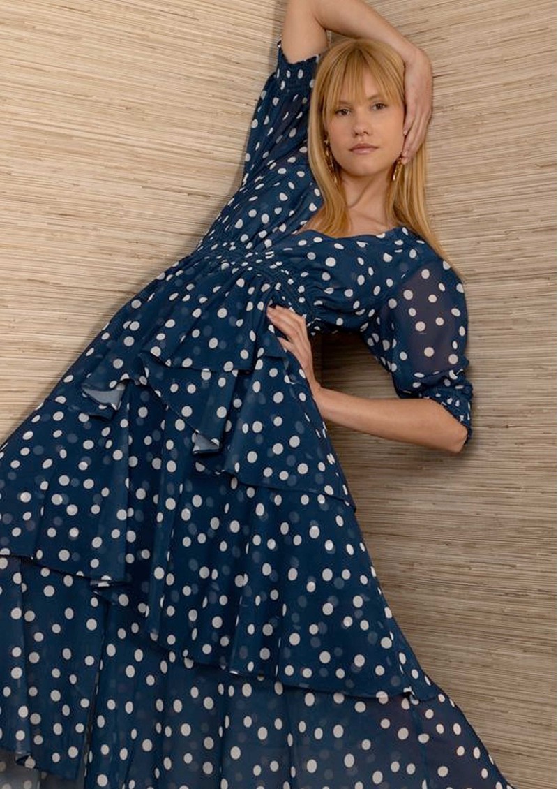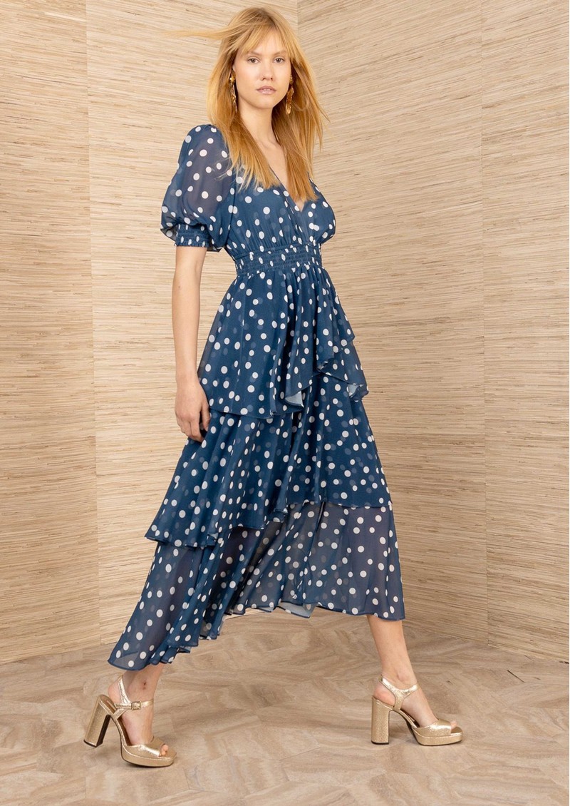 The HaleBob tiered polka-dot dress combines timeless charm with a flattering, feminine silhouette. Its midaxi length, tiered A-line skirt, and playful puff sleeves make it an effortlessly chic choice for any occasion.
