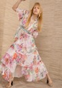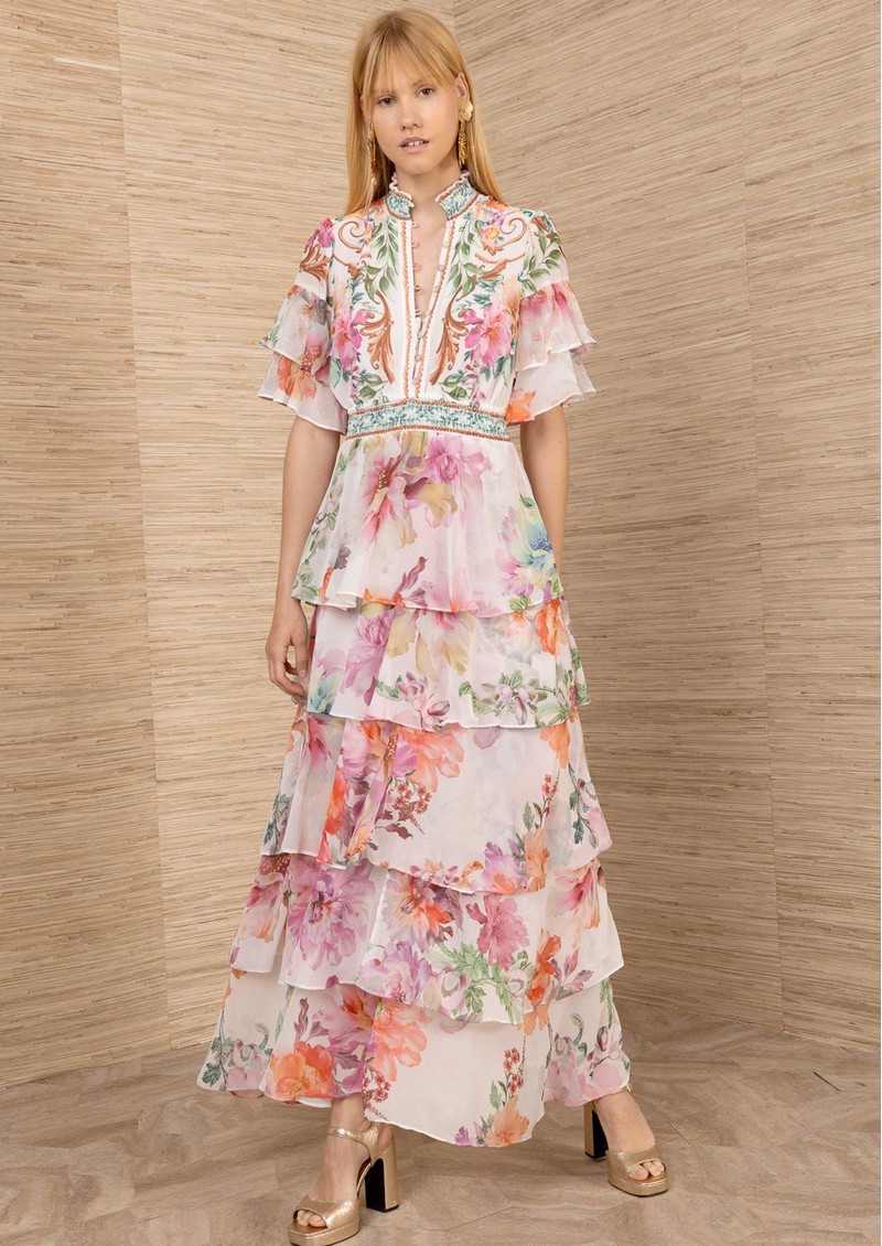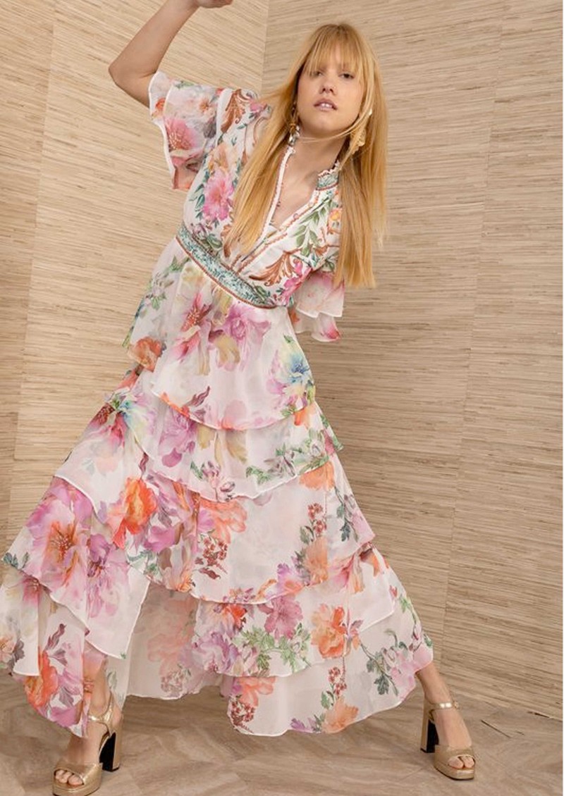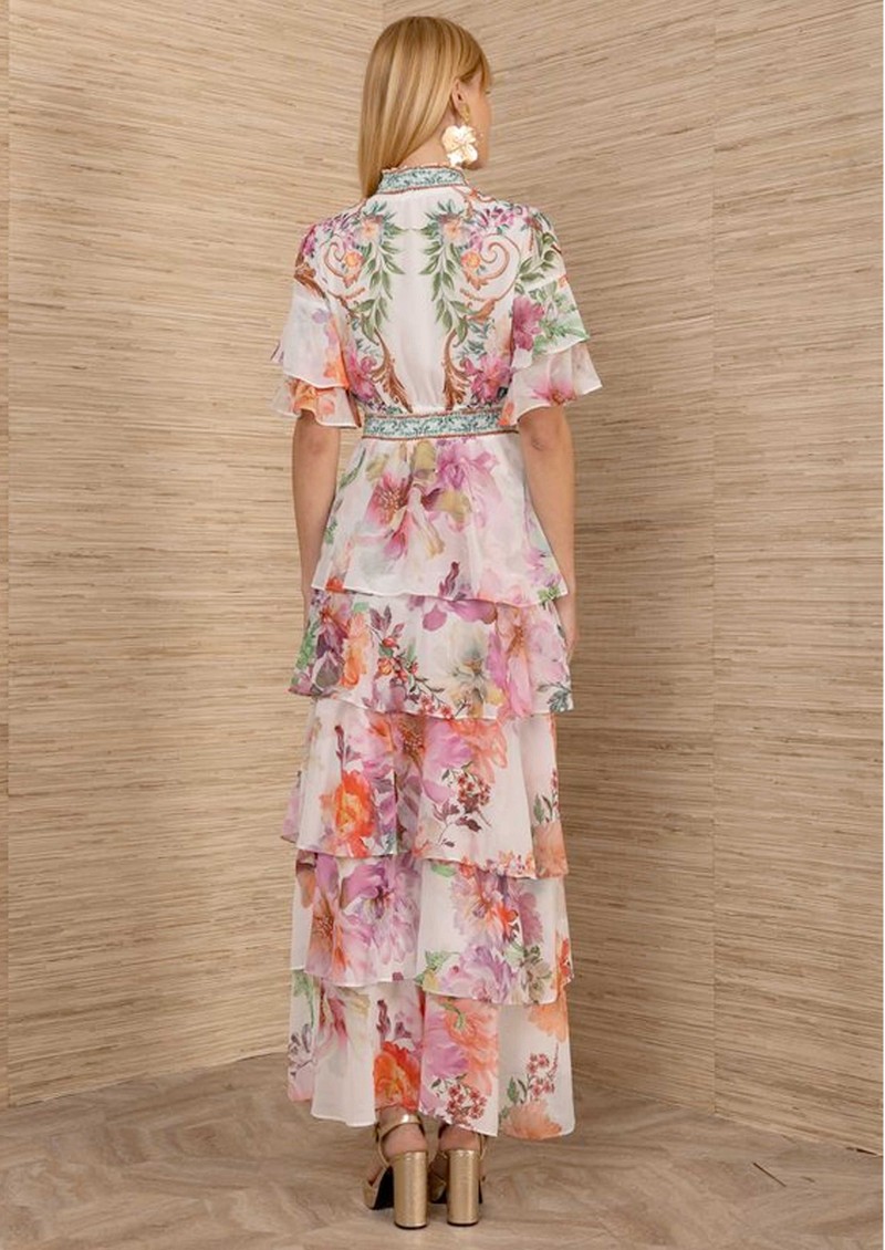 The HaleBob tiered chiffon maxi dress offers a romantic, floaty silhouette with its shirred stand collar, button-front detail, and defined waistband. Finished with a tiered A-line skirt and an all-over feminine floral print on an ivory base, it’s an effortlessly elegant statement piece.