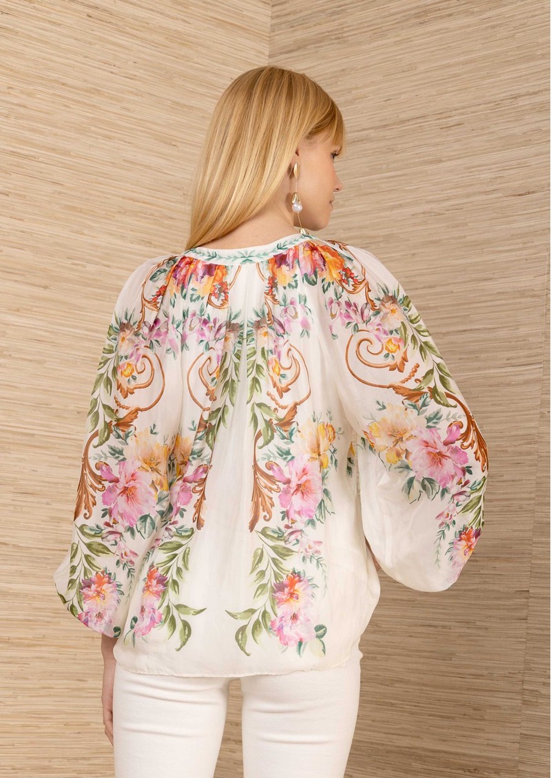 The HaleBob V-neck floral top in ivory showcases a vintage-inspired charm with its large, intricate painted floral print. Featuring a flattering V-neckline and full voluminous sleeves with shirred wrist cuffs, it’s a feminine and elegant wardrobe essential.