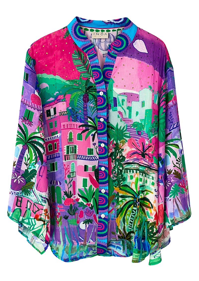 Decorated in a vibrant tropical landscape inspired print, meet the Inoa Cherry Shirt in Hermosa which will instantly update your wardrobe for Summer. Featuring a V shaped neckline, fluid 3/4 length sleeves and a button down front, other features include: