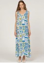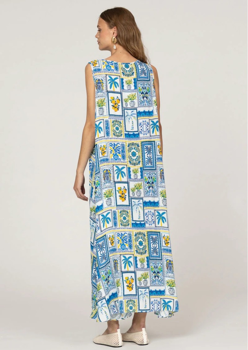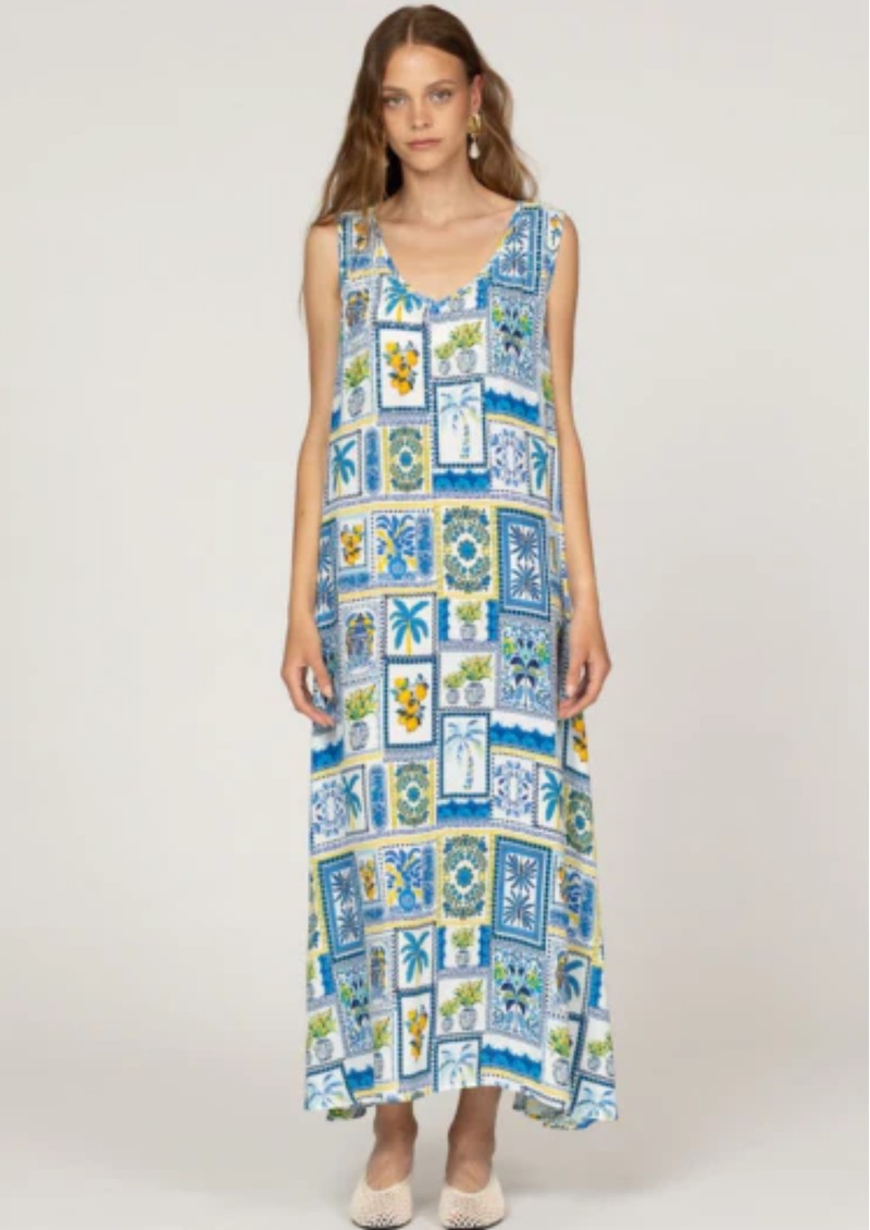 Say hello to the Inoa Daphne Dress. Crafted from a tropical inspired blue tile inspired print, complete with palm tree and citrus motifs. This easy piece features an A-line silhouette, a V shaped neckline and a maxi length finish. Style at home or away. Key features of this Inoa dress include:
