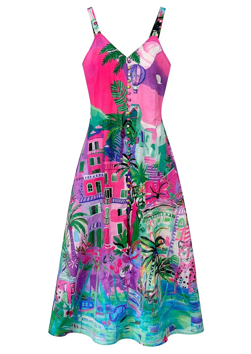 Introducing the Inoa Greca Dress, which is crafted from a premium poly linen. Featuring a striking and vibrant tropical inspired print, this dress features a button down placket, adjustable fabrics straps and a slit opening at the front. The ultimate Summer dress which also features: