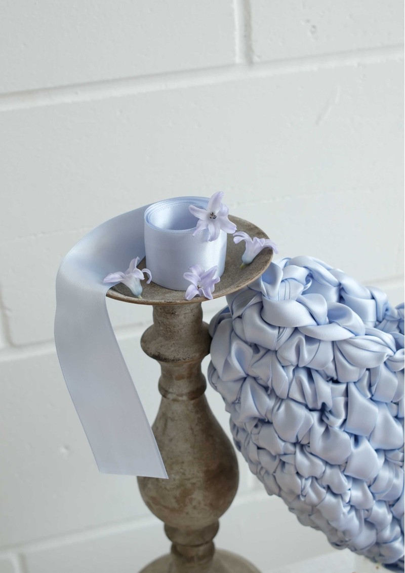 This Isla De Gar bag is made from satin ribbon with a metal popper. Beautifully handmade in London.