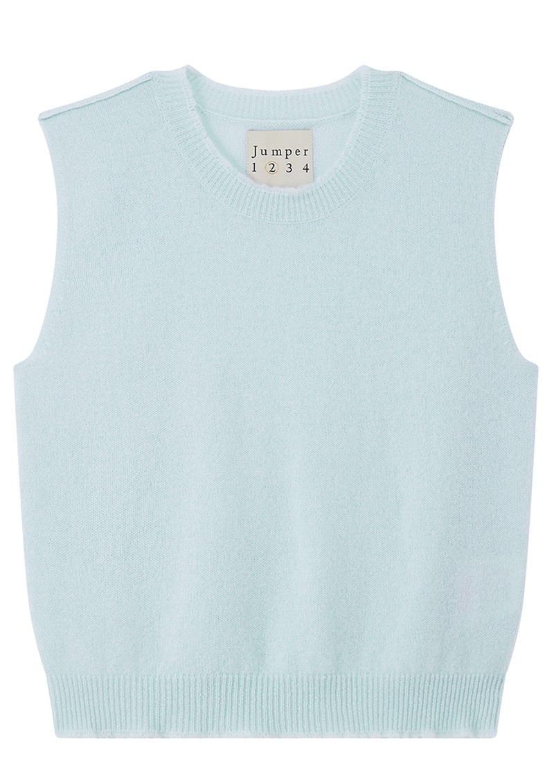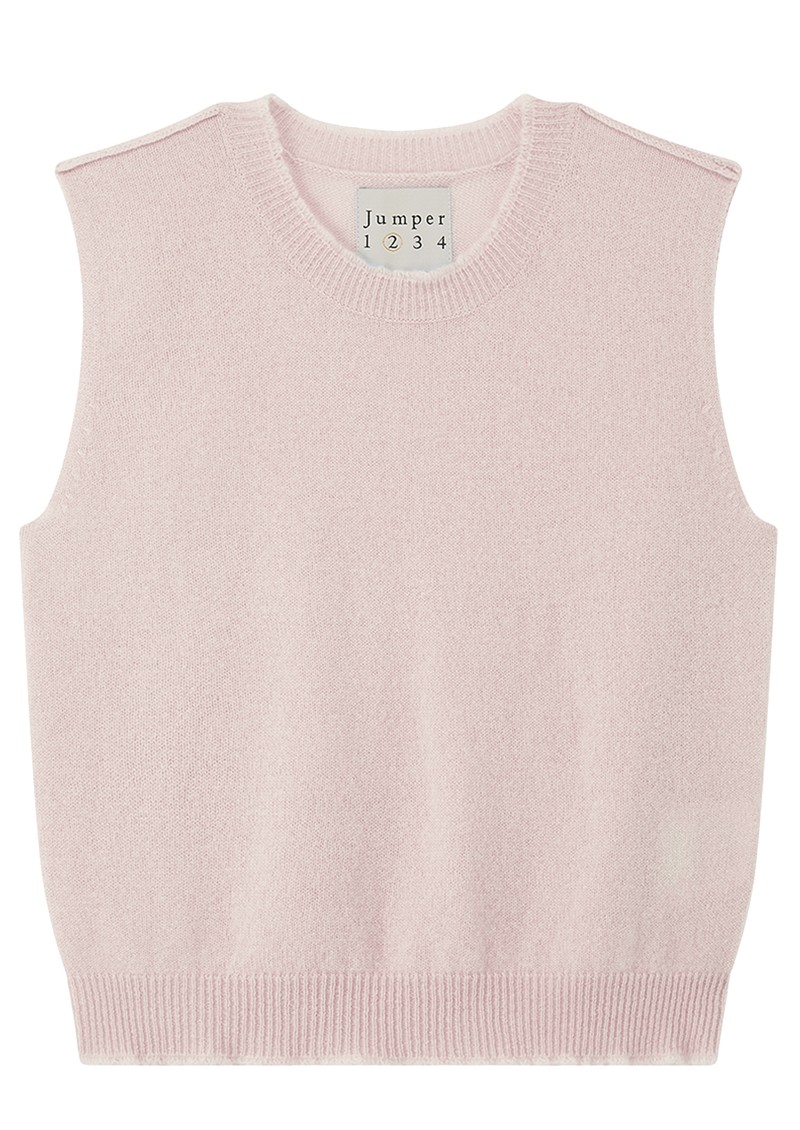 The Jumper1234 Distressed Cashmere Tank is crafted from ultra-soft cashmere in a soft Marshmallow hue, featuring a classic crew neckline, a clean sleeveless silhouette, ribbed trims, and a regular fit, finished with subtle distressed details for a modern, lived-in feel.