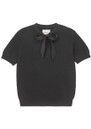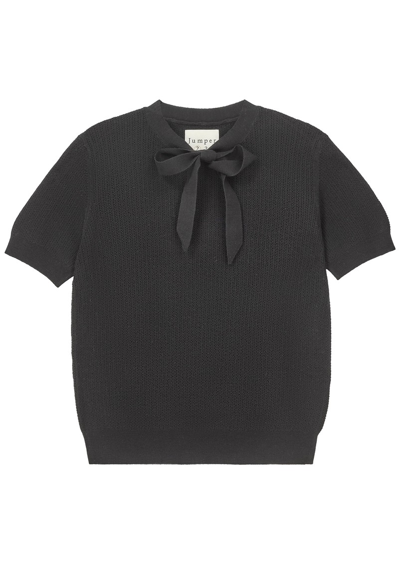 The Jumper1234 Ribbed Pointelle Tee is made from luxurious black merino wool for a soft and refined feel. It features a delicate tie-neck detail, short sleeves, and ribbed edges, creating a timeless, feminine silhouette.