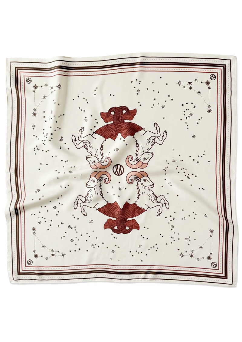 The Lescarf Capricorn Scarf in cream features a Capricorn-inspired motif print, adding a subtle zodiac touch to any outfit. This 65 cm lightweight silk square can be styled in numerous ways-around the waist, as a necktie, on your bag, or draped elegantly over the shoulders.