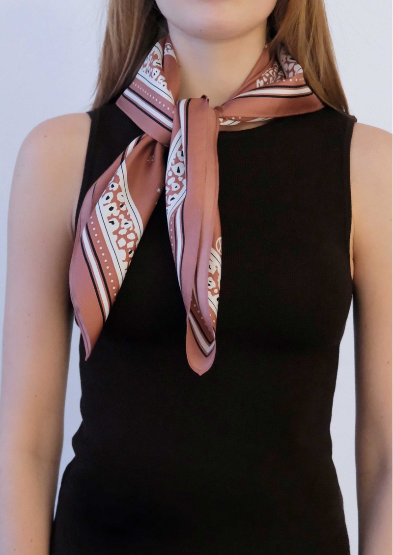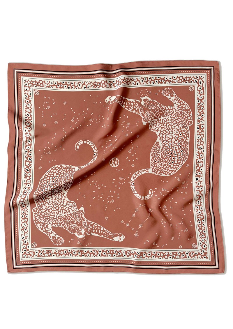 The Lescarf Gemini Silk Scarf brings effortless elegance to any outfit, crafted from sumptuous silk in a warm sand tone. Adorned with two leopard-print motifs on a celestial-inspired backdrop, its generous 65cm size allows it to be styled around the neck, as a headscarf, or tied around a bag for a chic, modern accent.