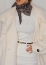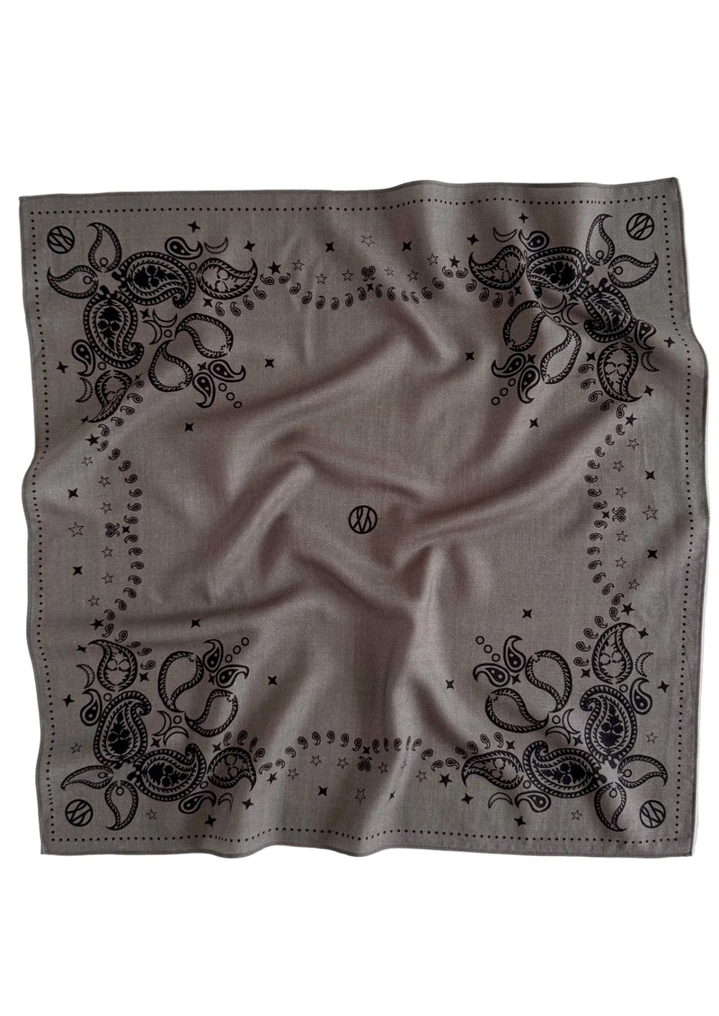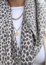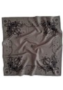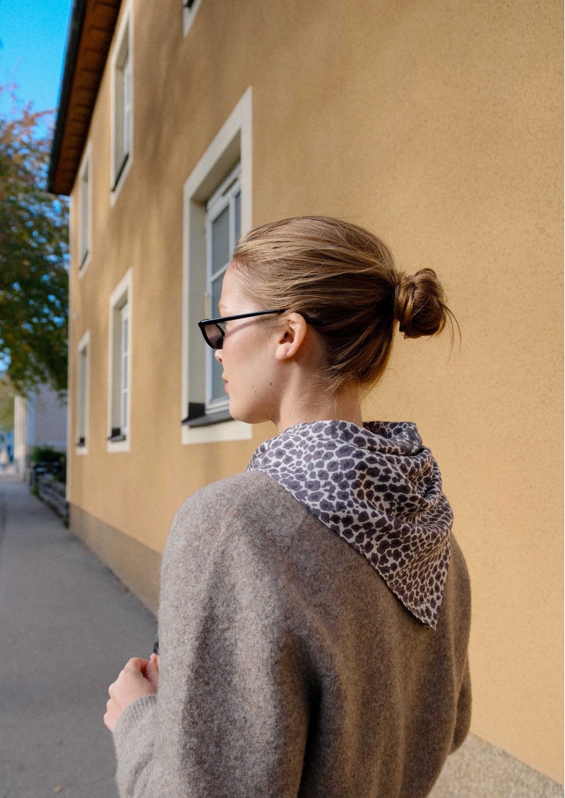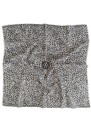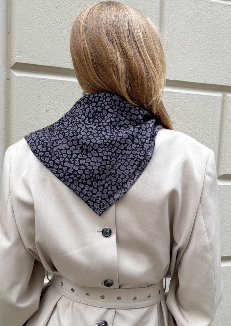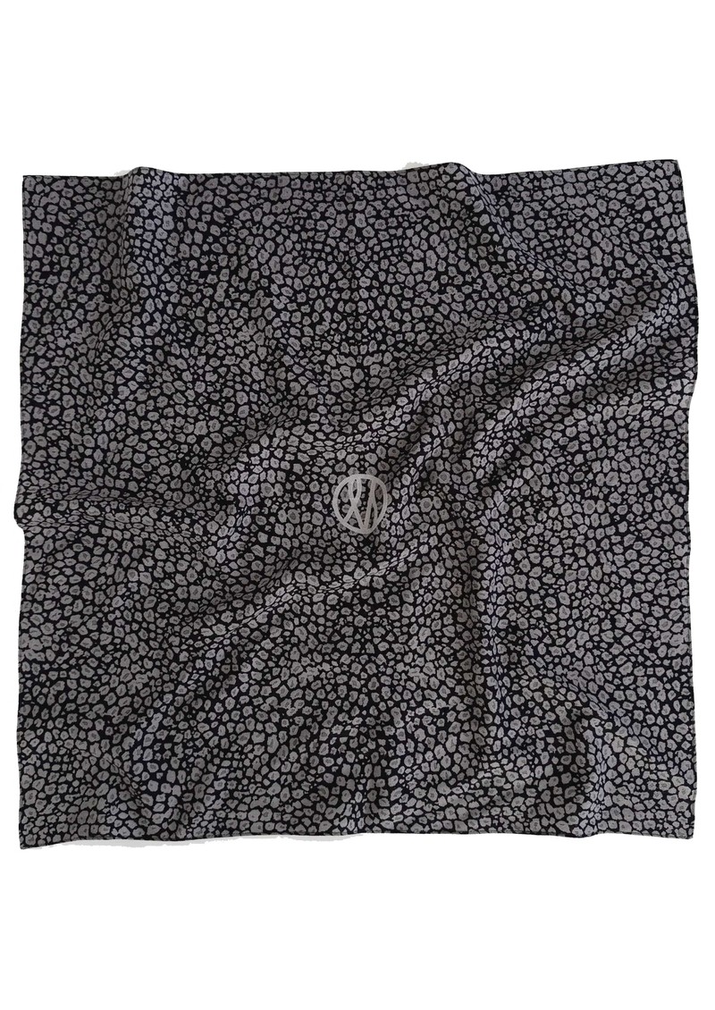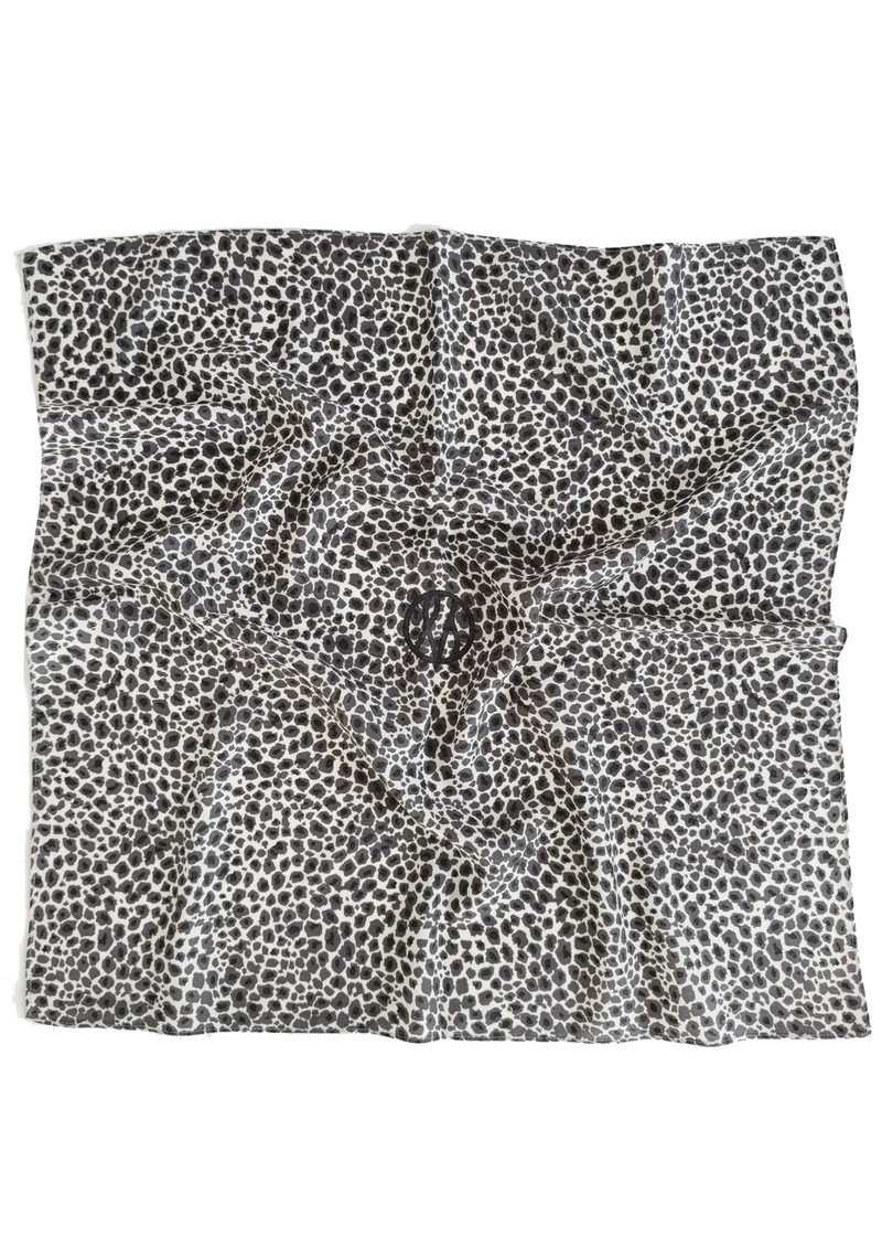 The Lescarf Wool Scarf in grey and black features a striking abstract animal print, crafted from a soft wool-silk blend for warmth and sophistication. Its 65cm square shape makes it versatile to wear around the neck, cinch at the waist, or drape effortlessly over your bag.