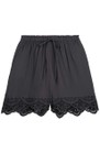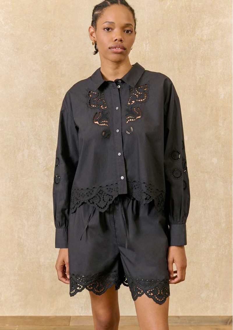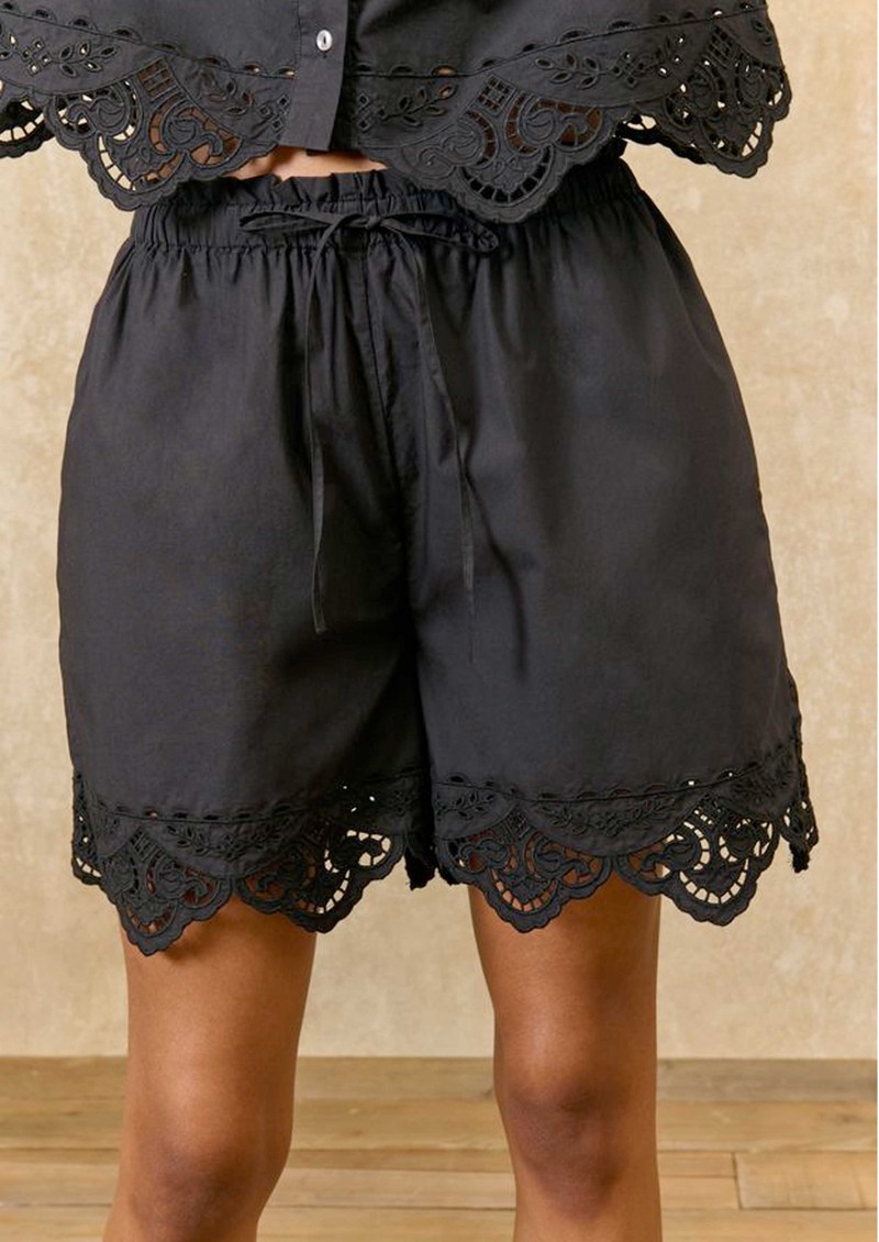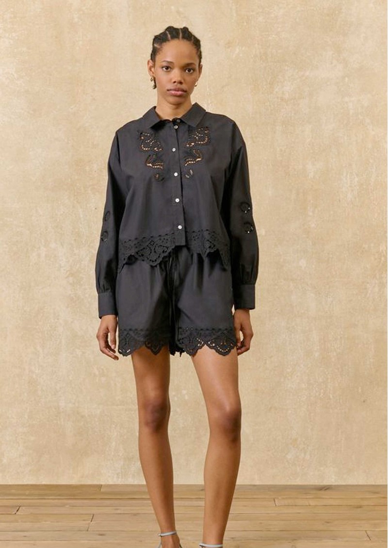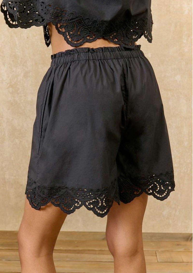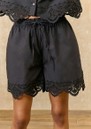 The Louise Misha Boxi Shorts in black are an easy, everyday staple crafted from crisp cotton poplin with a relaxed, wide-leg silhouette for effortless comfort. Delicate embroidered openwork and scalloped trim add a feminine, artisanal touch that elevates this casual style.