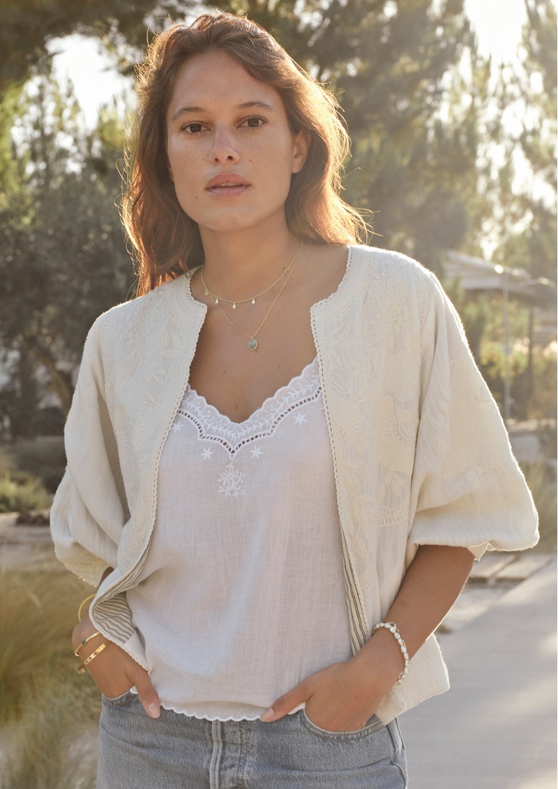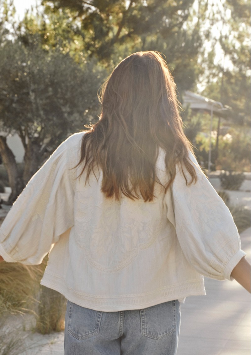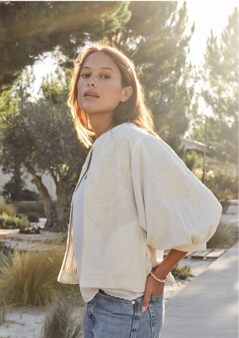 Elevate your wardrobe with the M.A.B.E Averi Embellished Jacket in ivory, a beautifully crafted piece that brings effortless elegance to any outfit. Featuring an open, collarless design with intricate floral embroidery, voluminous mid-arm sleeves, and an easy throw-on style, it’s perfect for chic layering.