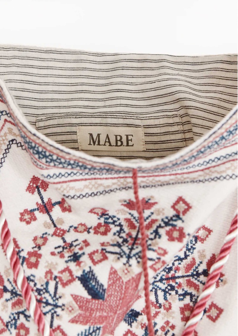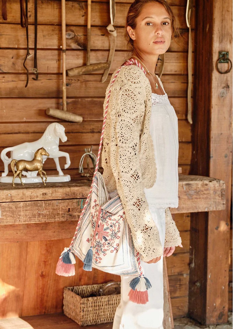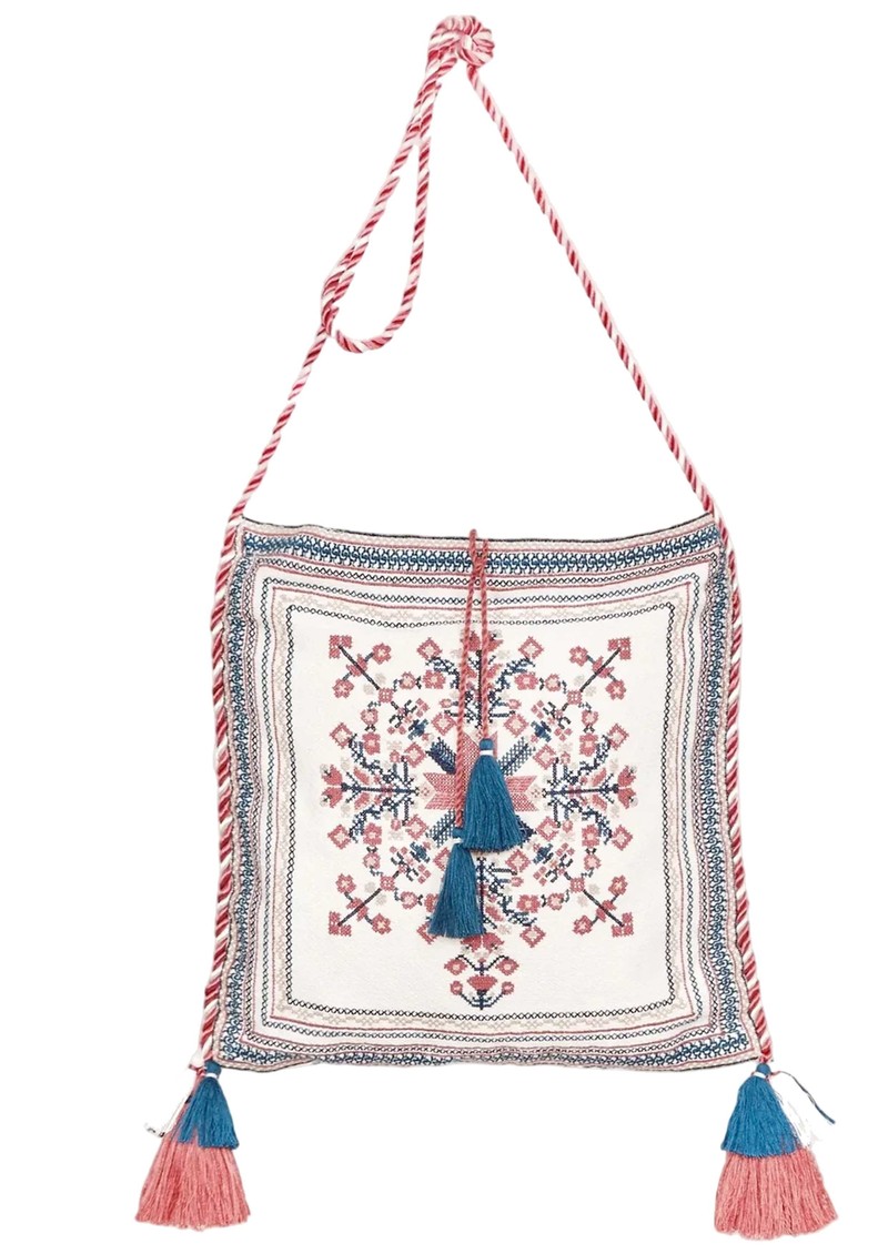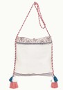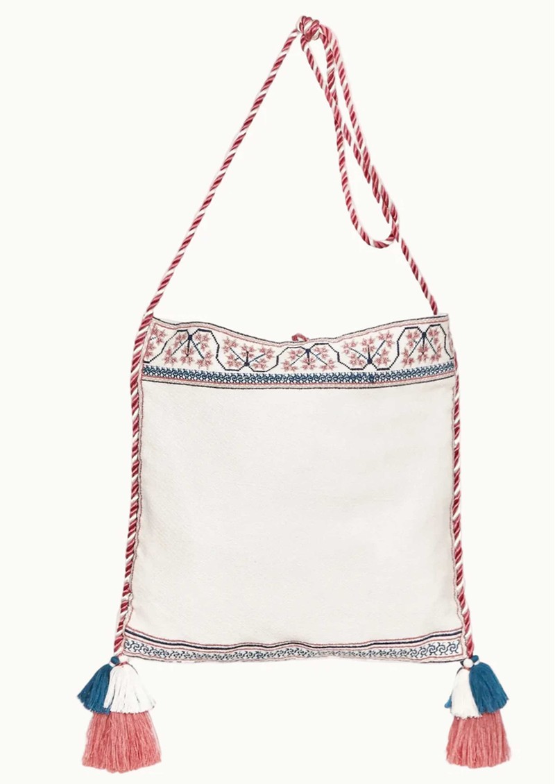 The M.A.B.E Calista Body Bag in Ecru/Multi is a bohemian-inspired crossbody crafted from textured cotton, featuring intricate cross-stitch floral and border embroidery, a woven striped lining, cotton tassel drawstring ties, and an adjustable multi-cord strap for effortless, stylish wear.