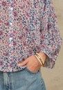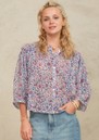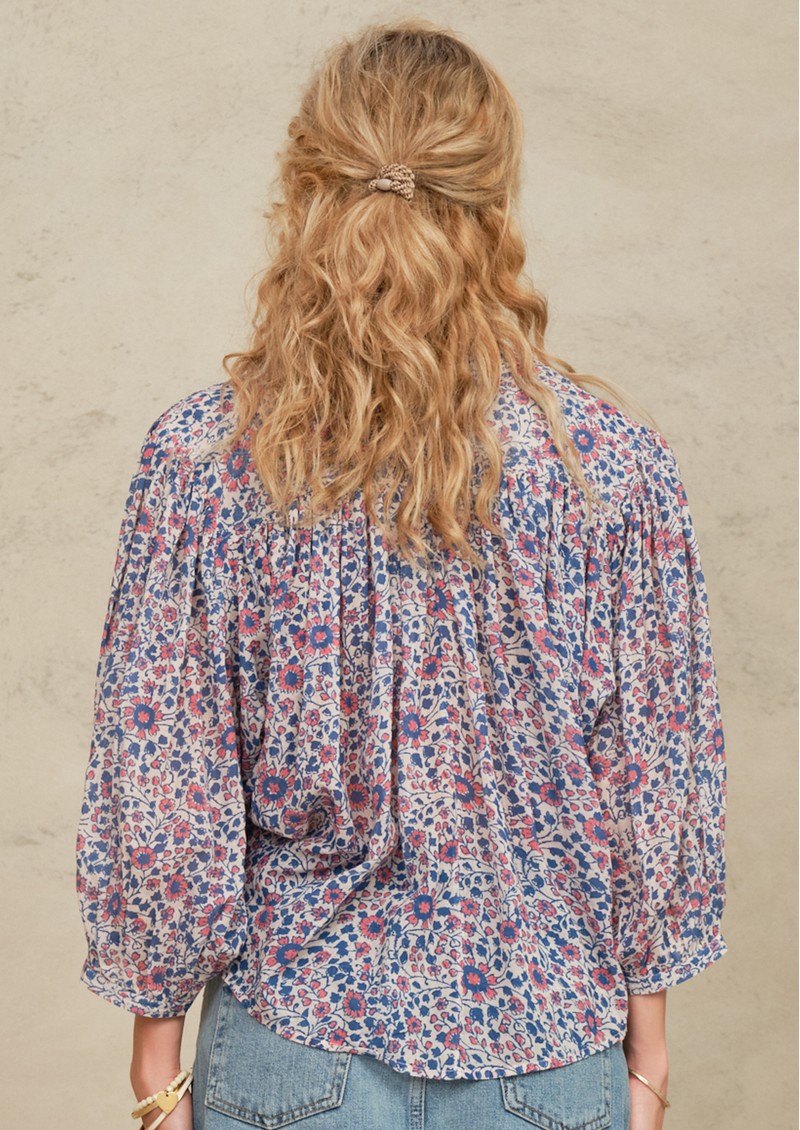 The M.A.B.E Della Print Long Sleeve Top in blue/pink is a breezy, collarless blouse crafted from lightweight cotton and covered in a playful blue and pink floral print. It features a central button closure and loose sleeves that fall to the mid-forearm for a relaxed, effortless fit.