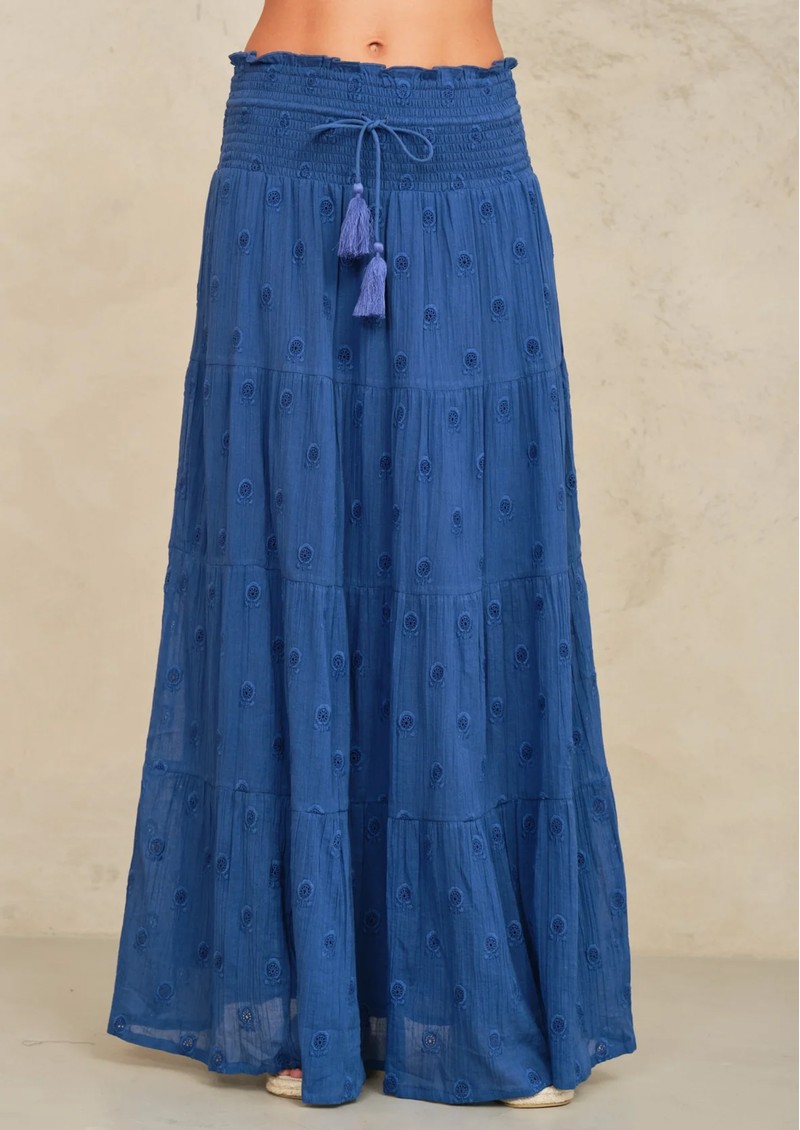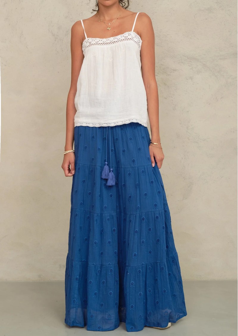A great Summer staple from one of our favourite brands, MABE. This Frani Maxi Skirt is designed in Cobalt blue and finished with embroidered floral motifs throughout. This lightweight cotton skirt also features: