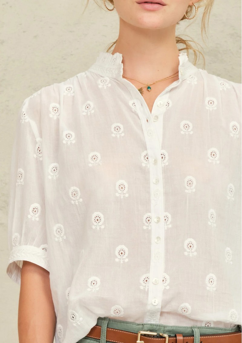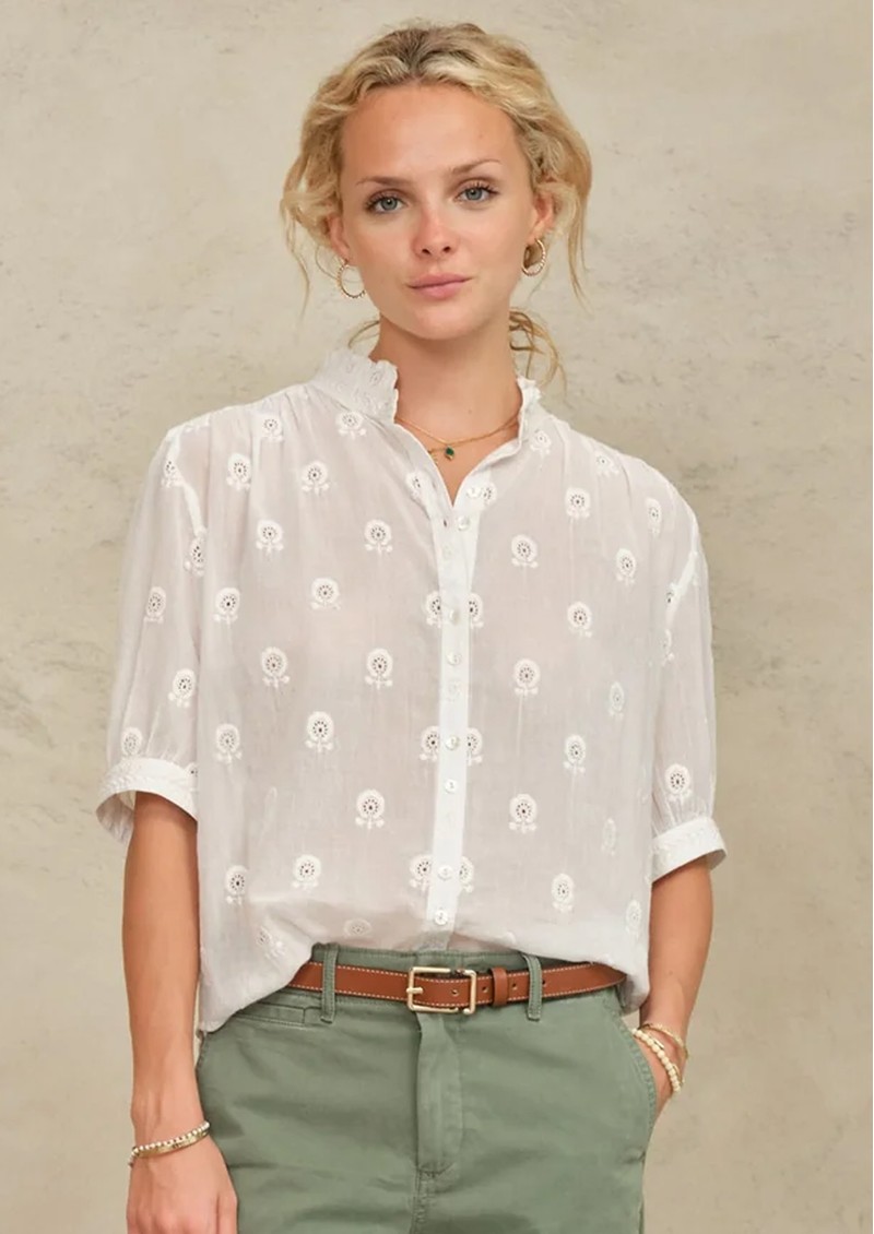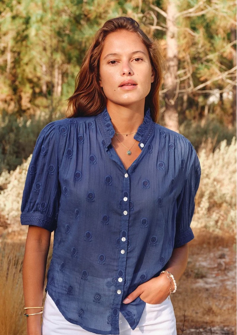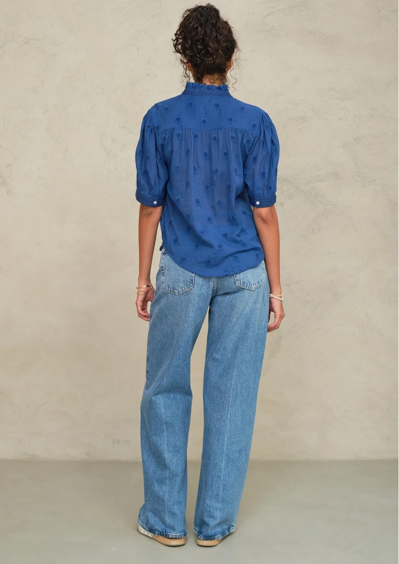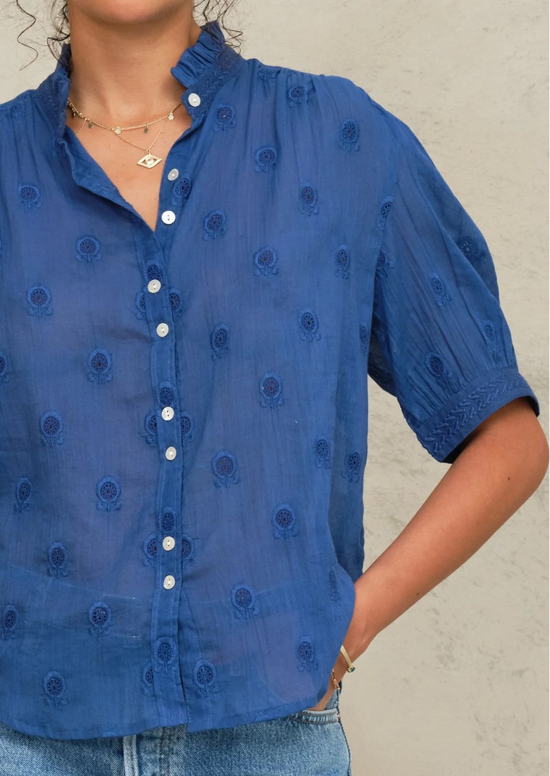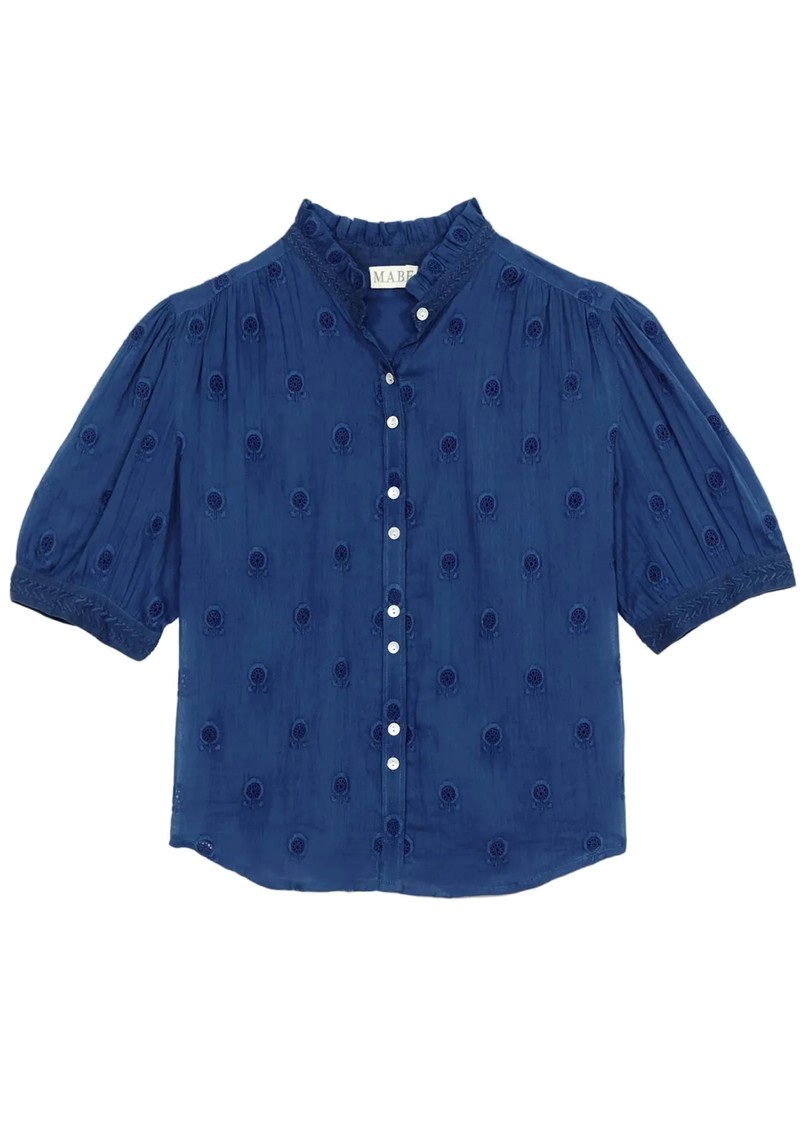Introducing the feminine Frani Embellished Short Sleeve Top from MABE. The perfect Spring Summer top, designed in a colbalt blue and decorated in embroidered and cut ouf floral motifs. Other features include: