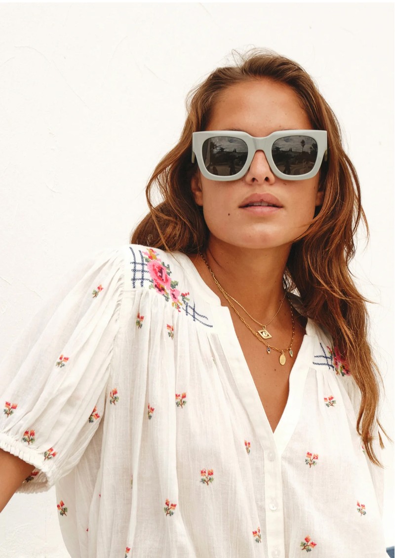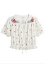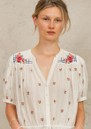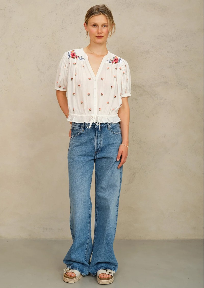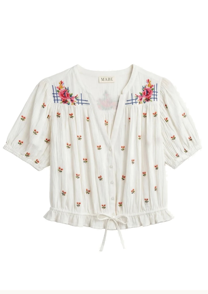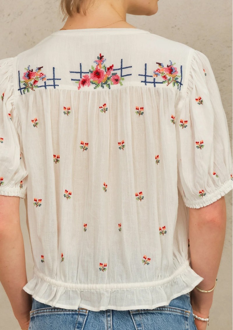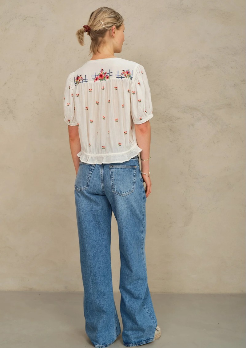 M.A.B.E Harlie Short Sleeve Embroidered Top - Ecru & Multi