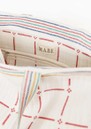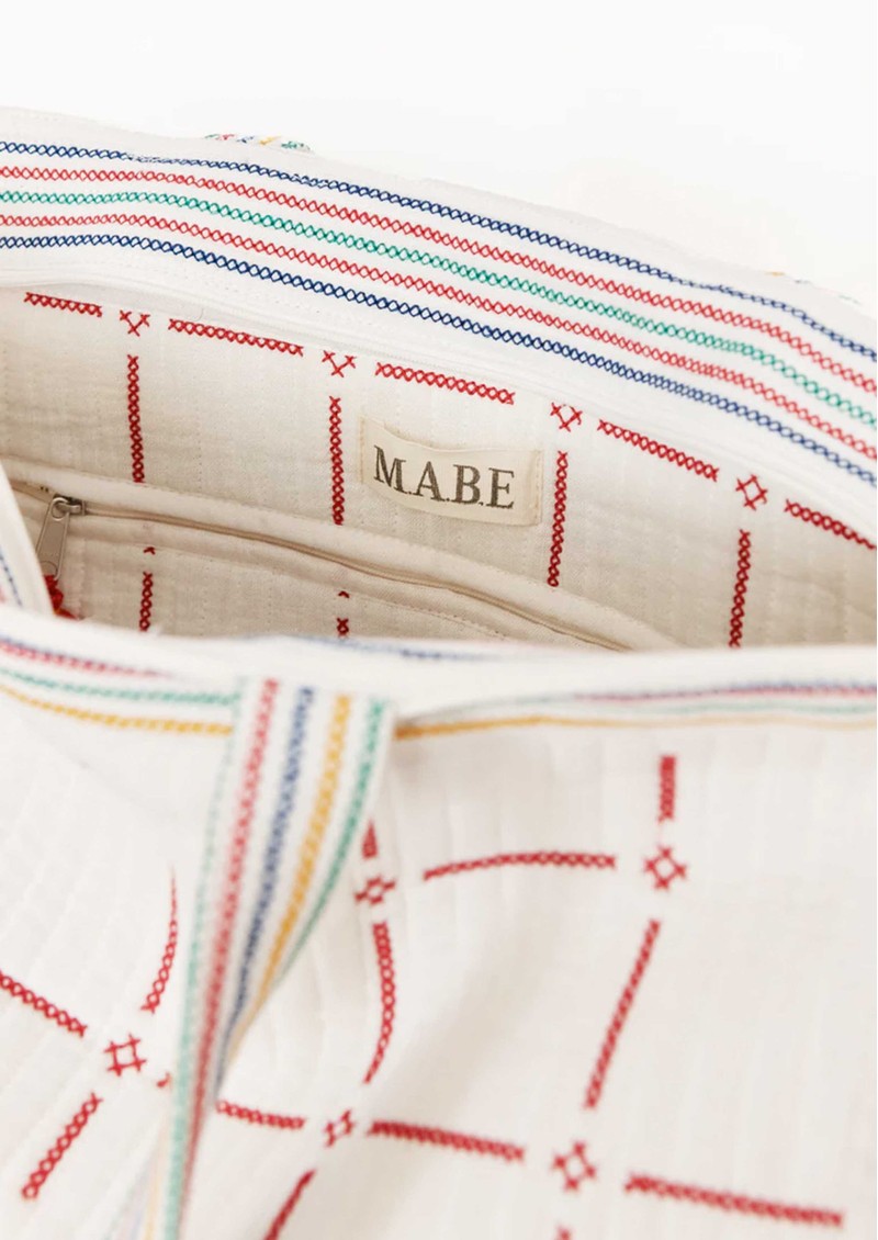 The M.A.B.E Laney Embellished Quilted Tote in Ecru/Multi is a bohemian-inspired everyday bag, crafted from soft quilted cotton with cross-stitch floral and linear embroidery, cotton striped lining, and drawstring tassel details, combining effortless style with practical functionality.