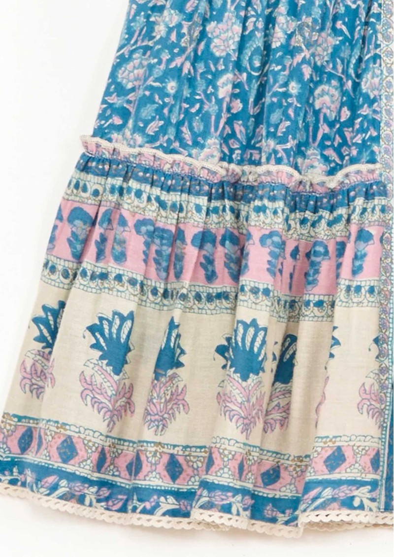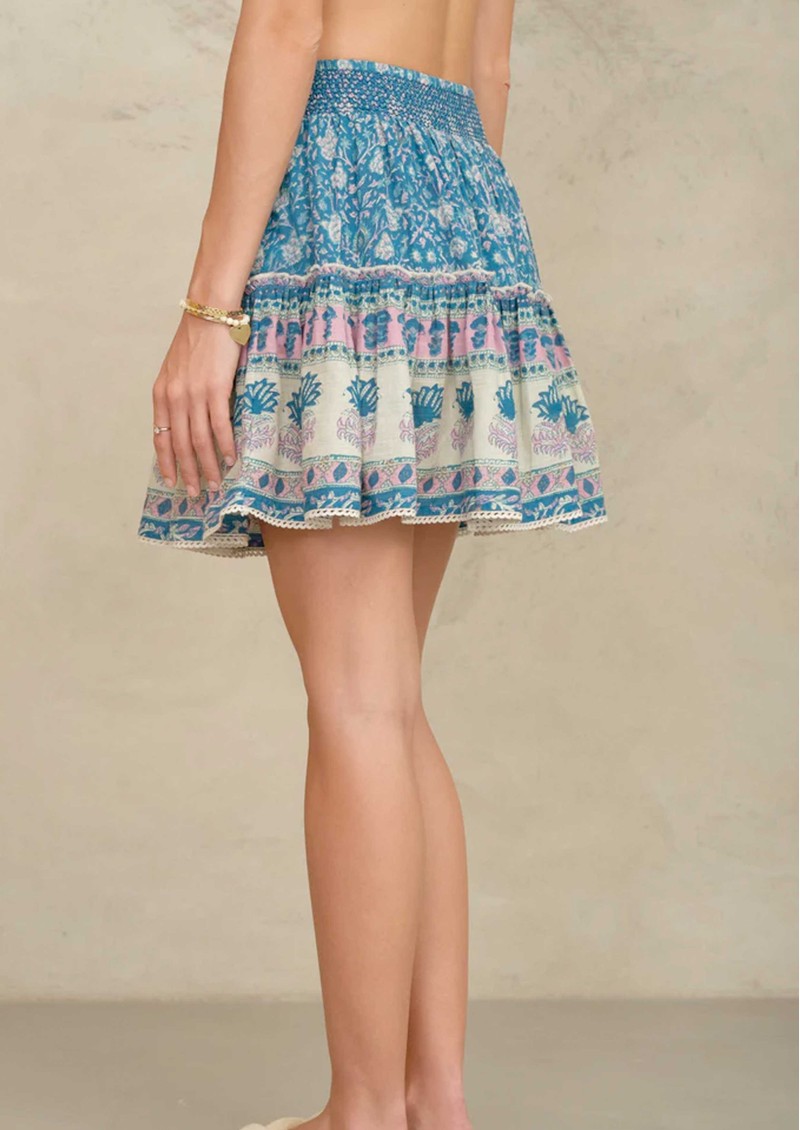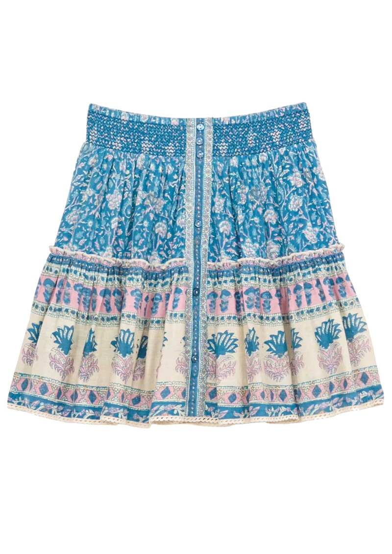 The M.A.B.E Myla Print Mini Skirt in Multi is a playful, bohemian-inspired piece crafted from 100% cotton with a summer floral and border block print, featuring an elasticated waist, tiered silhouette, lace trims, and front button detail for a free-flowing, feminine fit.