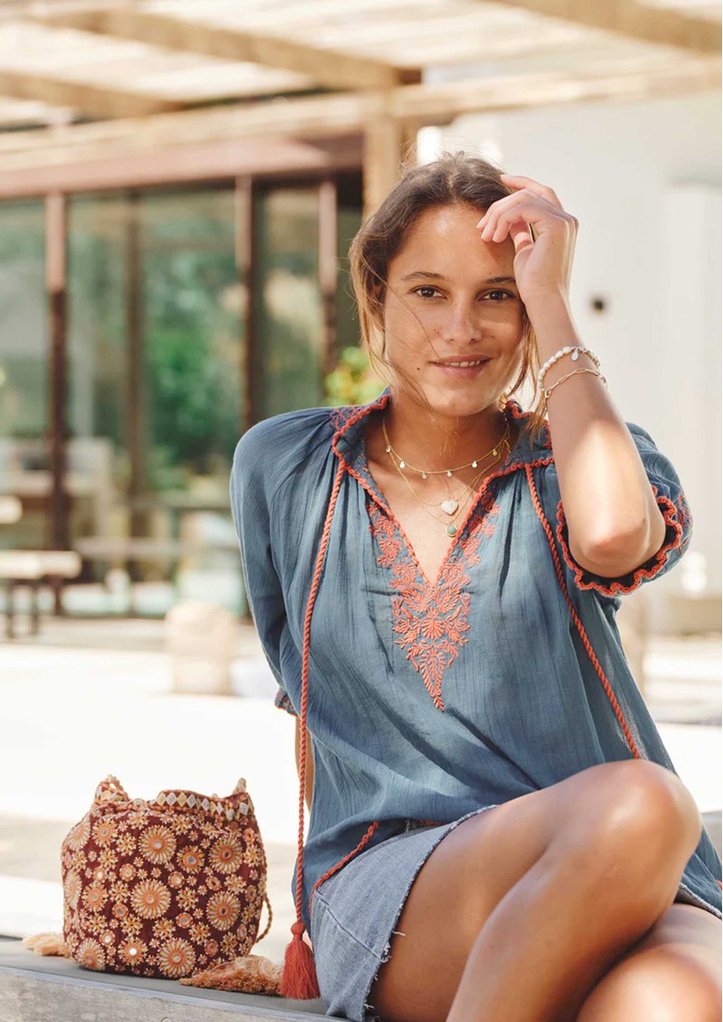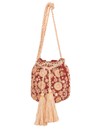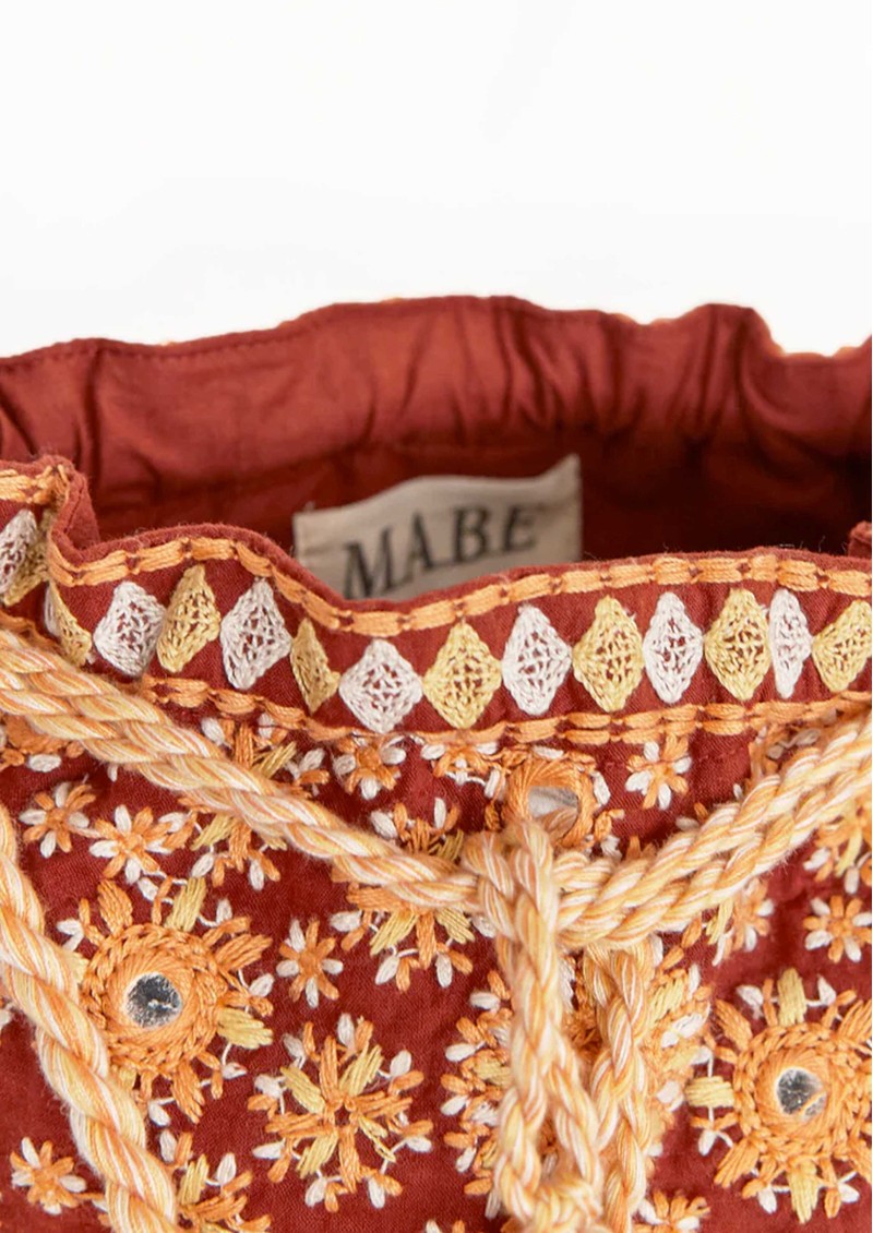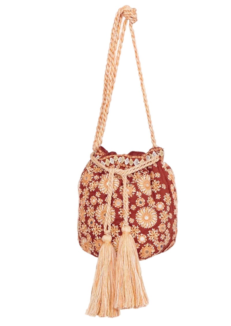 The M.A.B.E Suri Embellished Pouch in Rust is a romantic, bohemian-inspired accessory featuring intricate floral embroidery, shimmering mirrors, and sequins on a lightweight cotton base, finished with cotton tassels and an adjustable cord for versatile crossbody or shoulder wear.