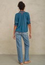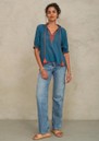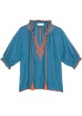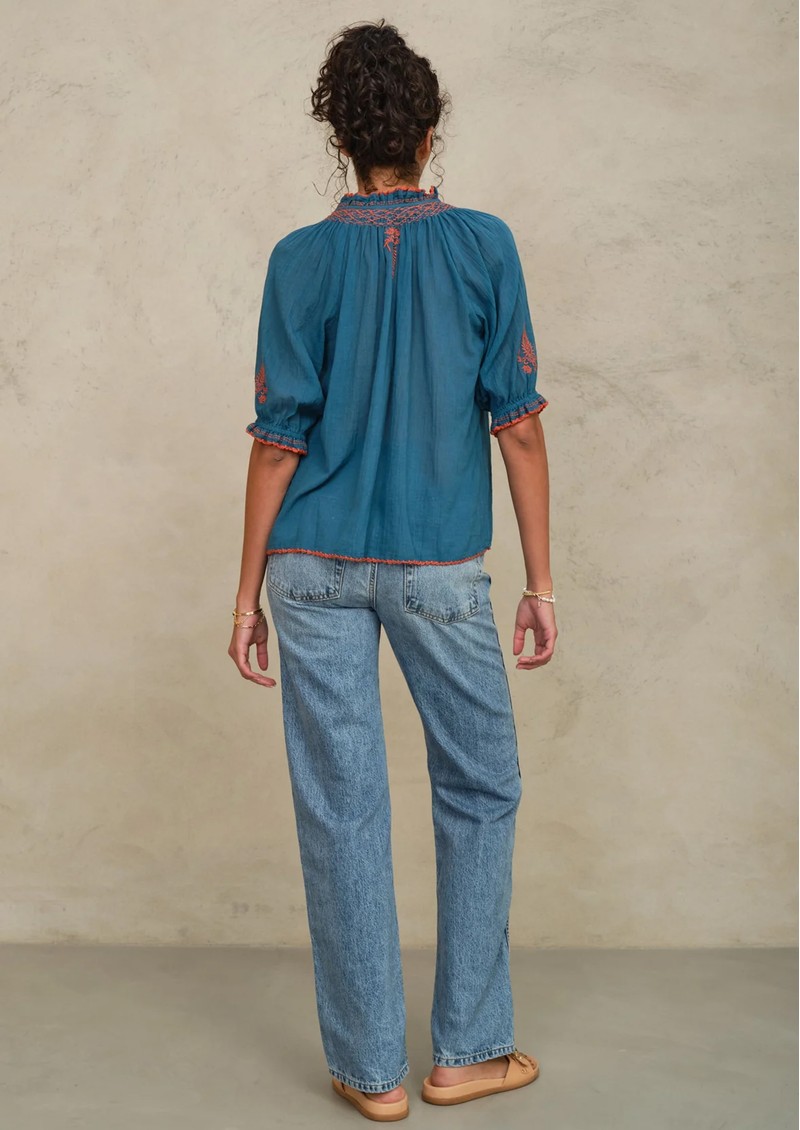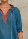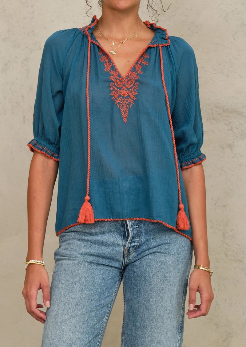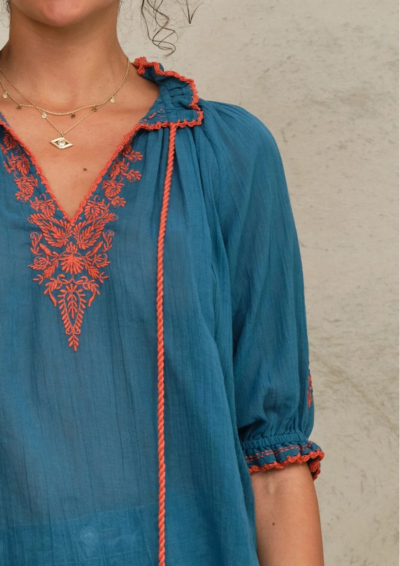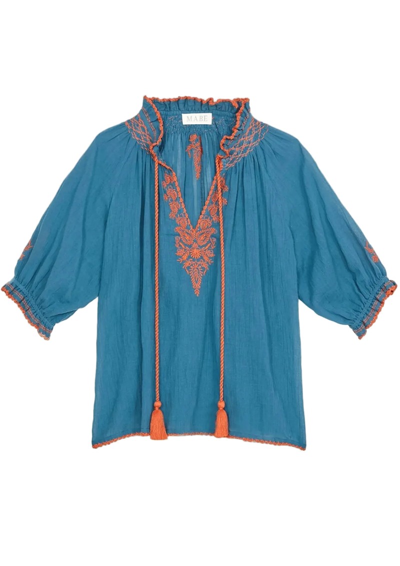 Designed in a lightweight cotton, this Talia Top from MABE features folk inspired embroidered in an orange rust hue, which contrasts well with the blue backdrop. Featuring a tie tassel neckline, short sleeves and crochet trims, this top is a Summer favourite. Other features include:
