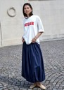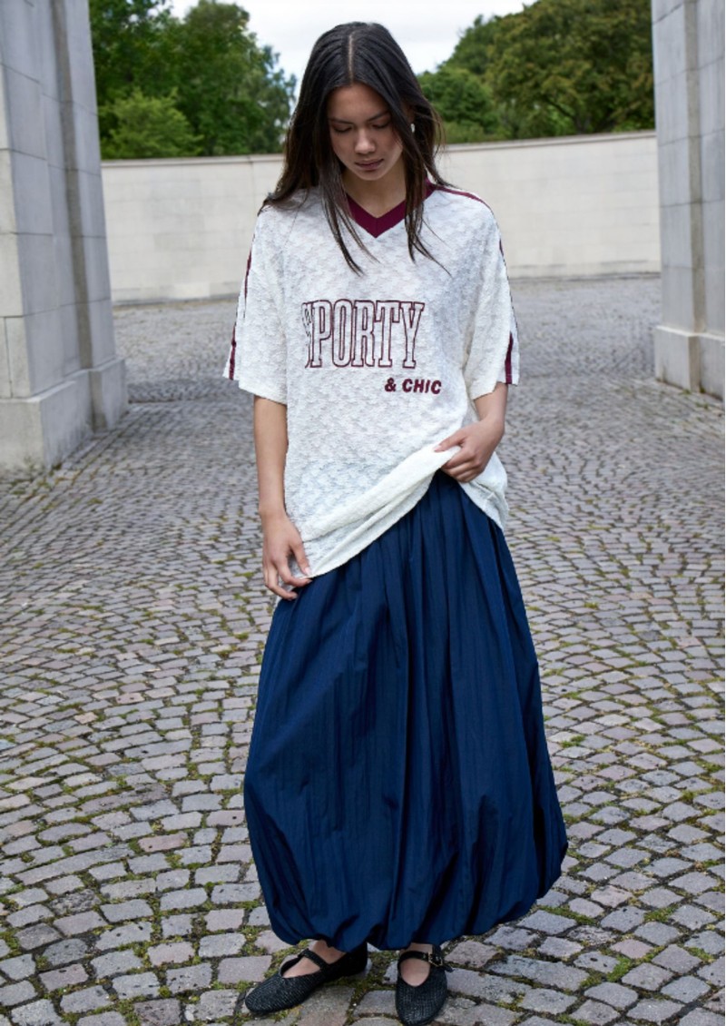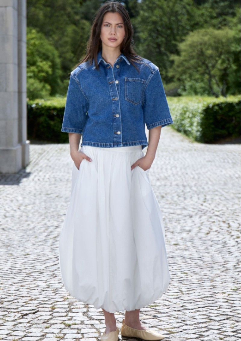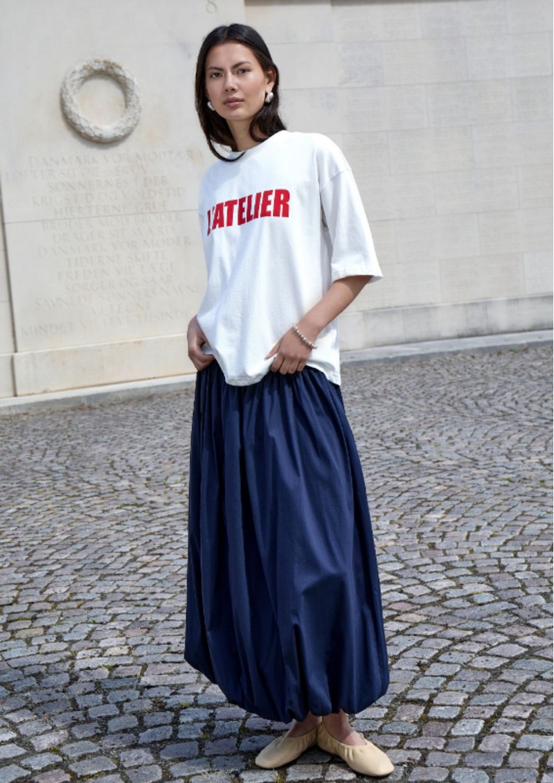 Embrace elegant volume with the Minus Oline Midi Skirt, featuring a sculptural silhouette that drapes beautifully into a playful bubble shape. The gathered waistband adds definition, enhancing the skirt’s midi-length design. Crafted from a lightweight cotton blend, this navy skirt is perfect for effortless style throughout the warmer months. Key features of this Minus skirt include: