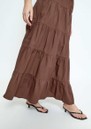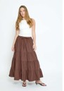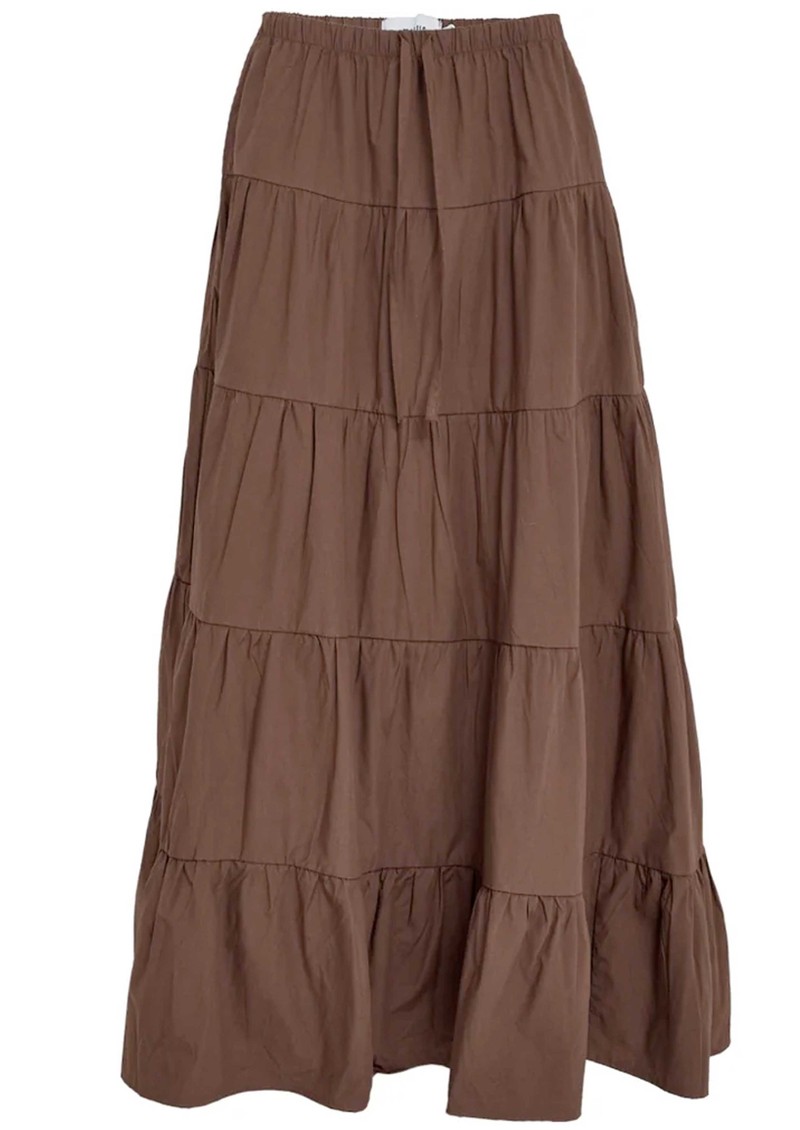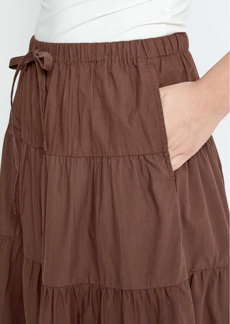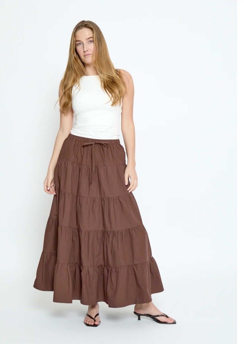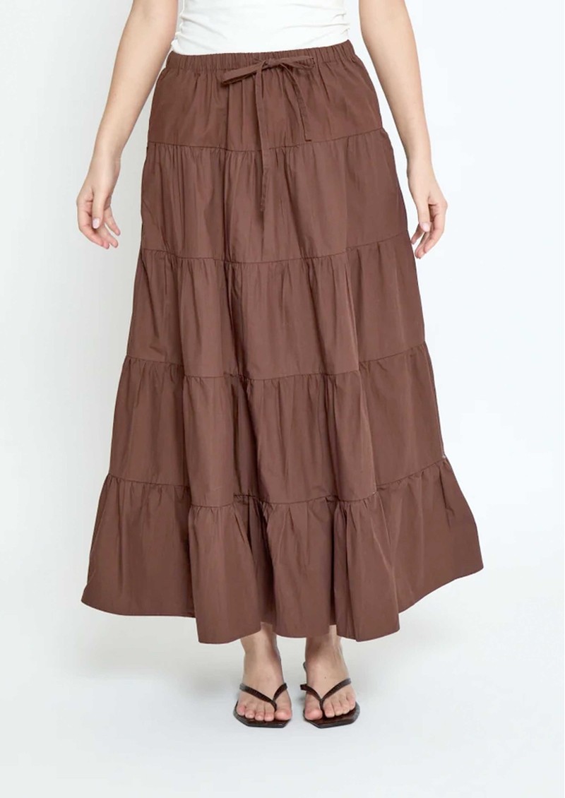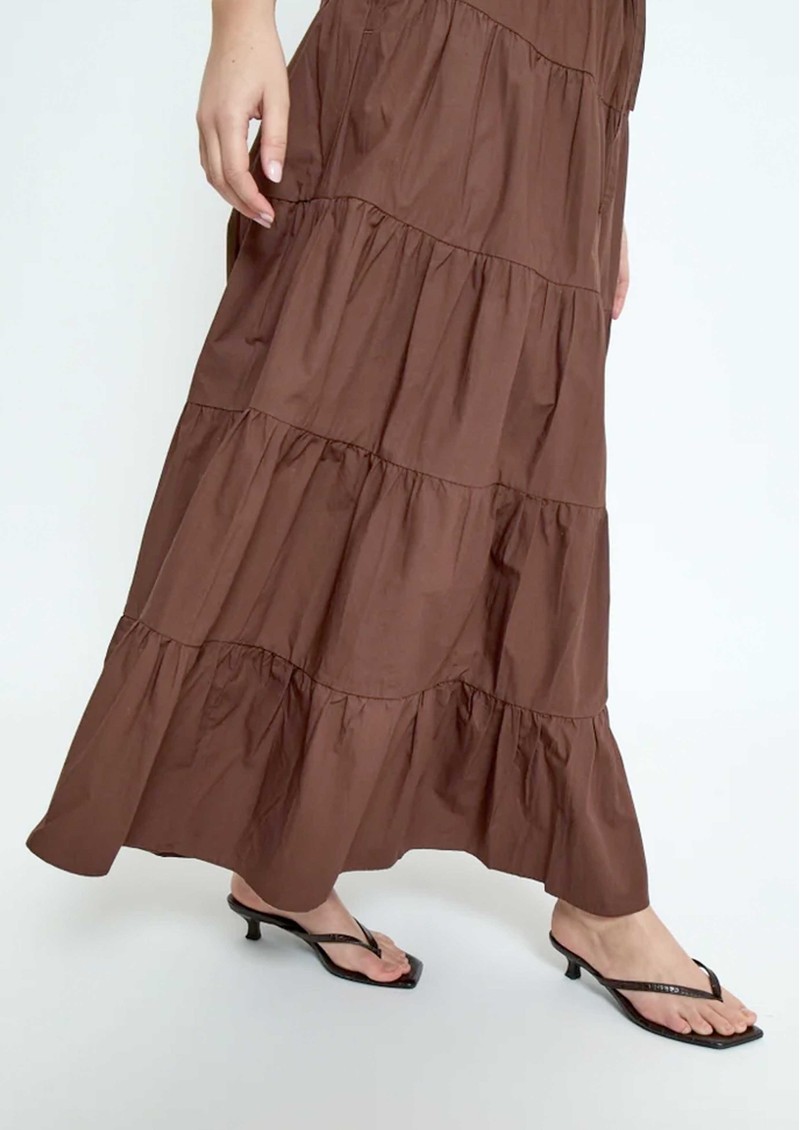 The Minus Msfreya maxi skirt in Chestnut is a relaxed boho-inspired style crafted from 100% cotton for an easy, breathable feel. Designed with a tie waist and tiered A-line silhouette, it flows into a full-length shape that moves beautifully with every step.