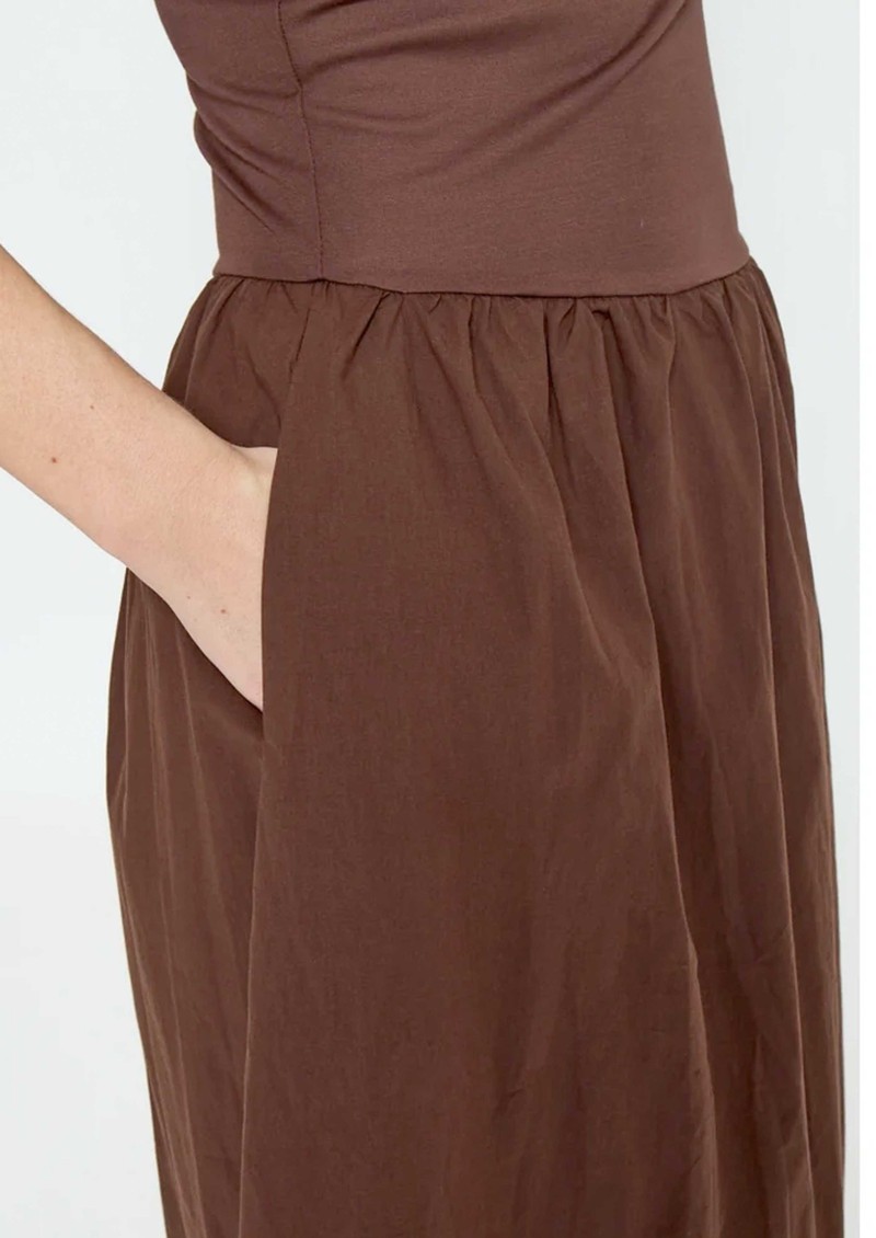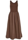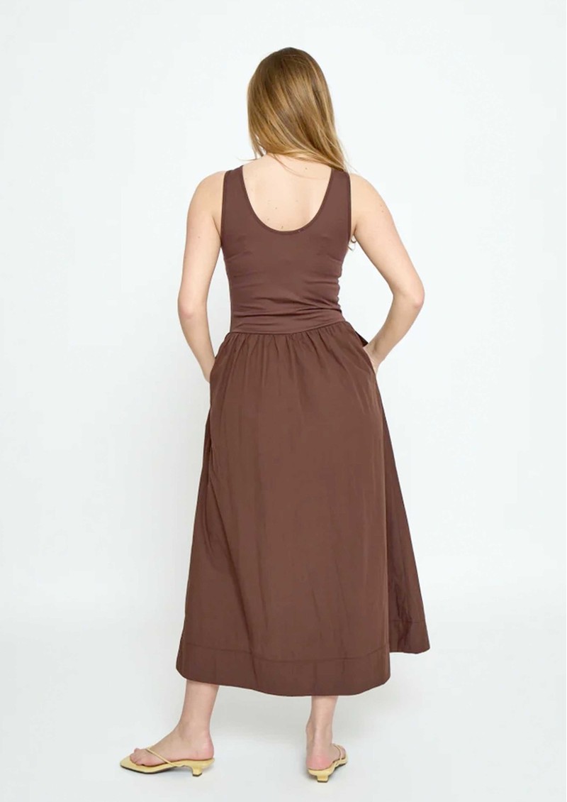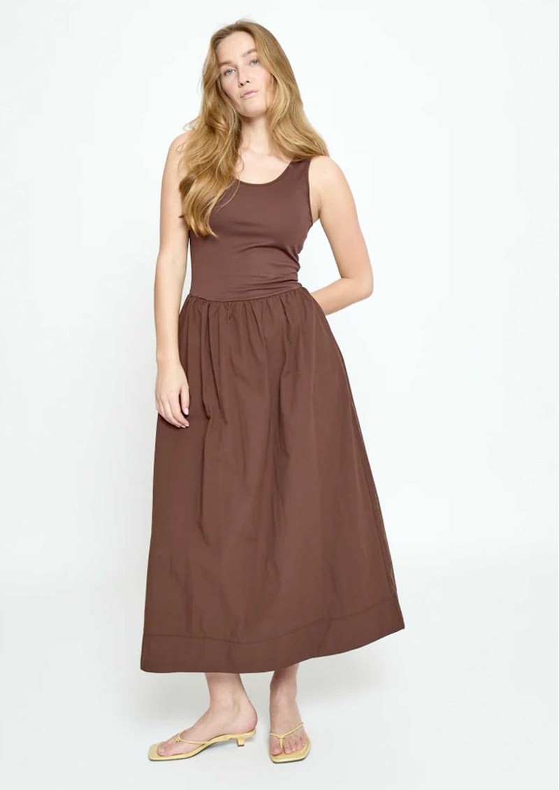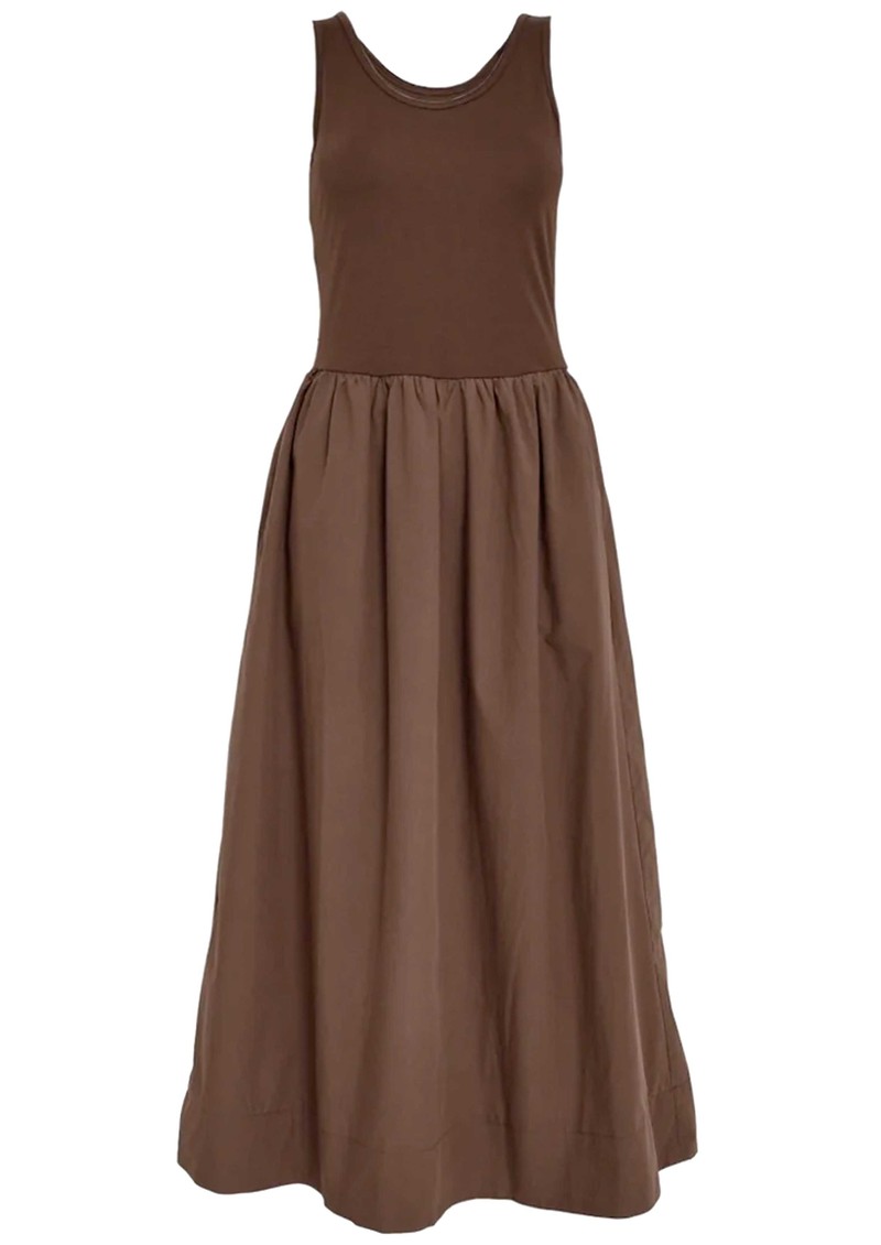 The Minus Msmarie midi dress in Chestnut is a sleek, minimal style designed with a flattering fitted bodice that flows into a softly flared A-line skirt. A clean scoop neckline and sleeveless cut keep the silhouette modern and effortlessly elegant.