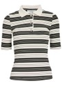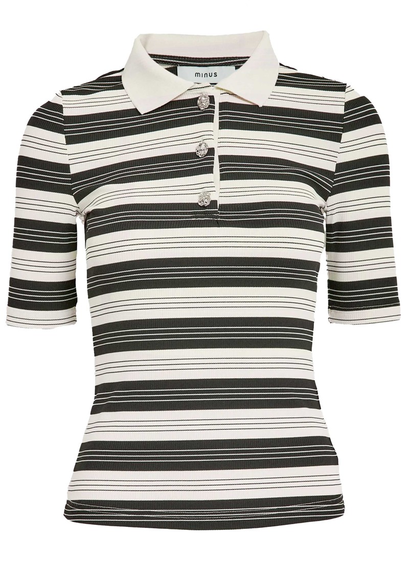 The Minus Pammie Top is a polo-style collared shirt in a close fit, crafted from a soft blend of Polyester, Viscose, and Elastane. It features a three-button closure at the neck, short sleeves, and a classic black-and-white striped design for a modern, sporty look.