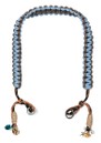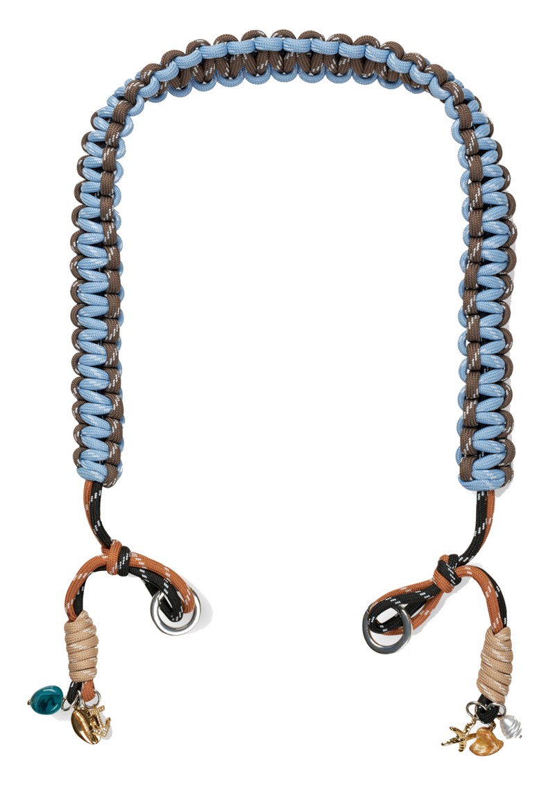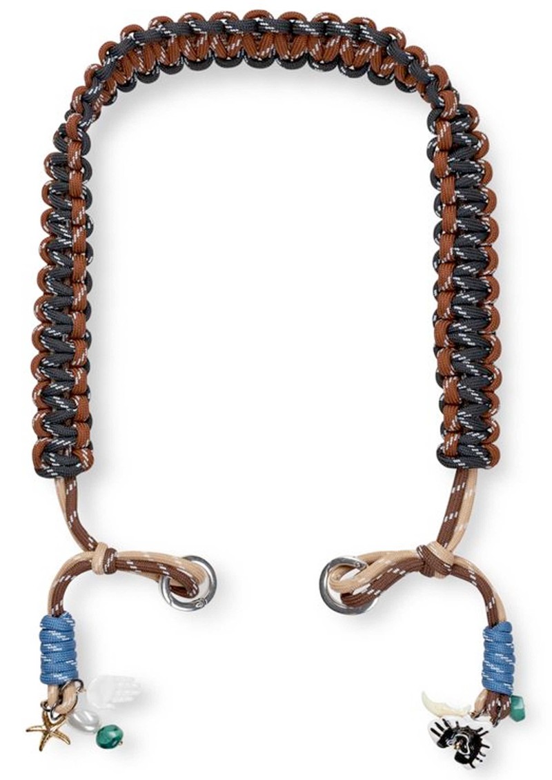 The Munthe Bayleen bag charm in black is a playful accessory featuring twisted polyamide strands with smaller trinket charms attached. Lightweight and versatile, it adds a fun, decorative touch to any bag.