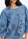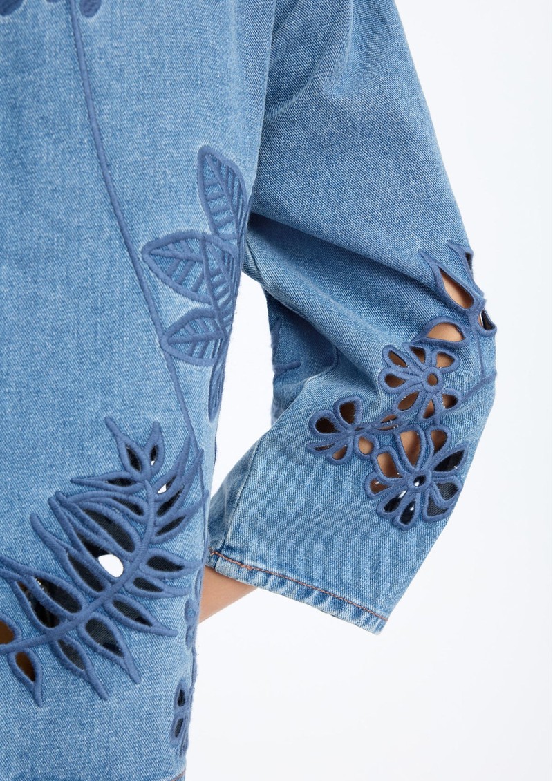 The Munthe Bramble is a chic denim top featuring a rounded neckline, all-over applique detailing, and pintucks at the shoulder seams for subtle texture. With 3/4 length sleeves, a square boxy fit, and a classic denim blue hue, it’s crafted from 100% cotton for comfort and effortless everyday style.