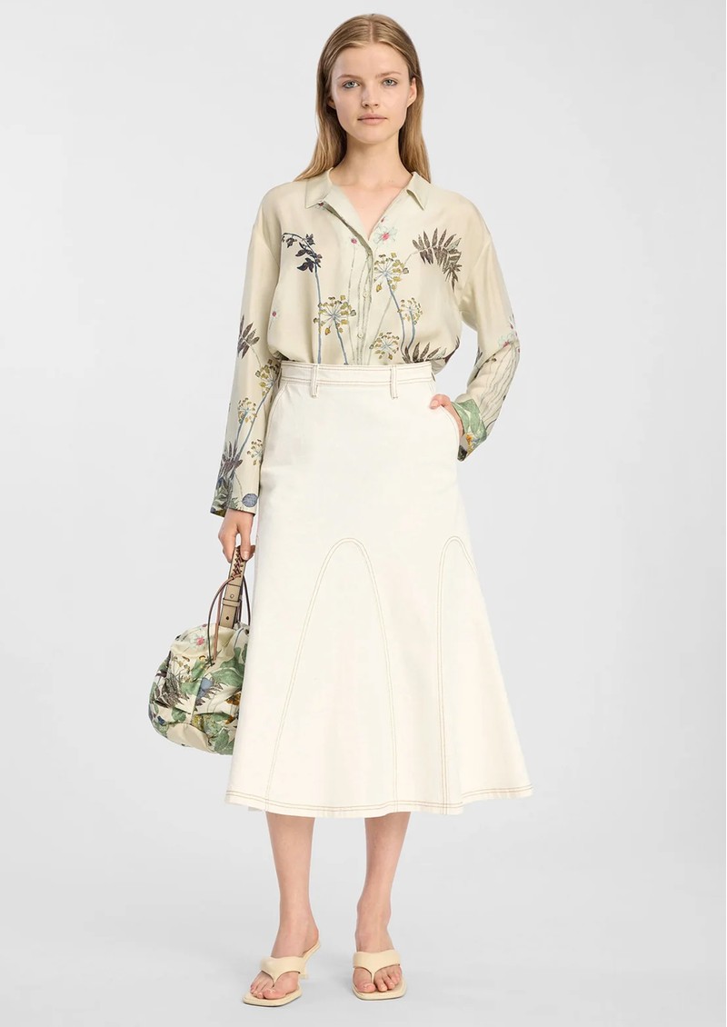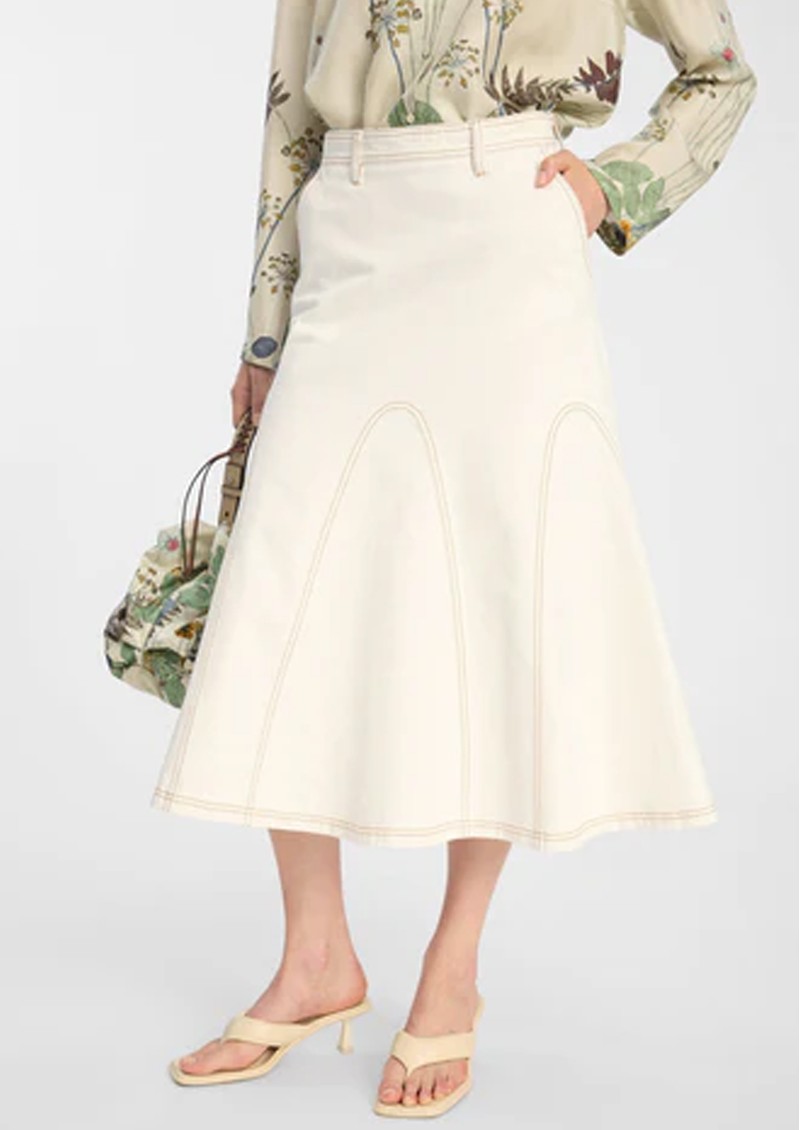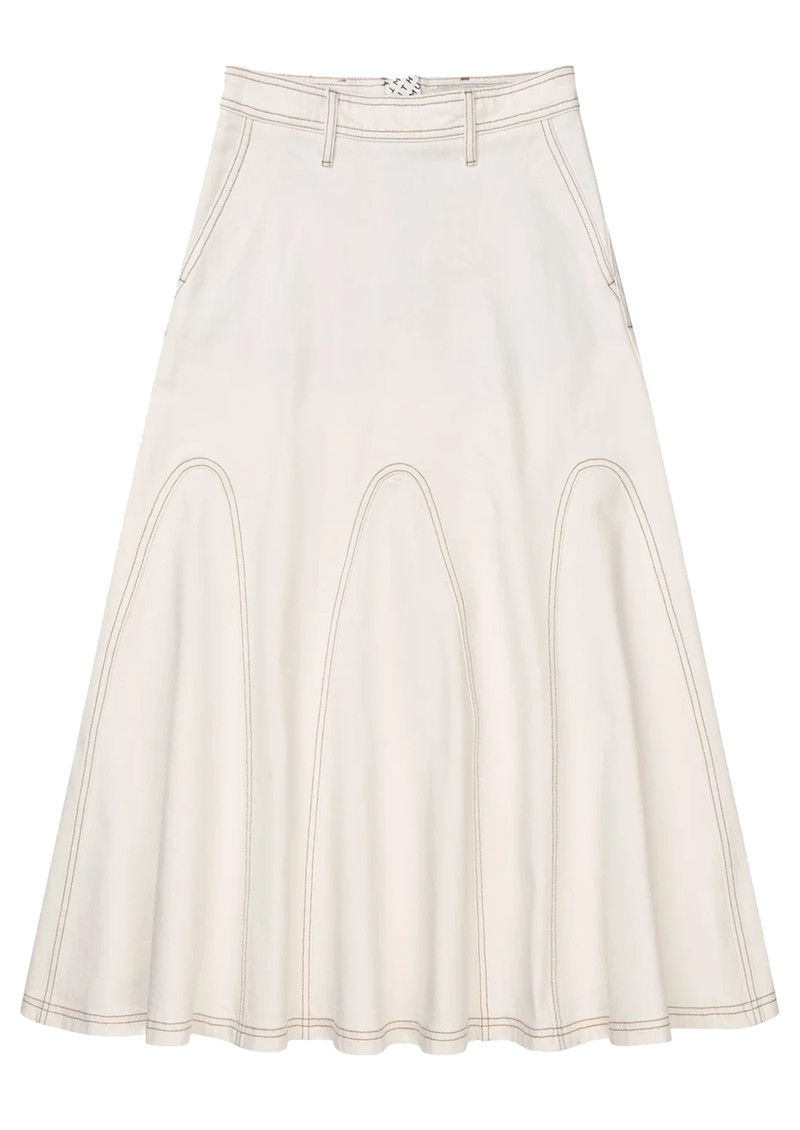 Introducing the Munthe Braylin Skirt, designed a light, soft ivory denim and cut to a flattering midi length. Featuring a flared feminine hem and structured seam lines, this skirt is extra special. Other features include: