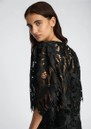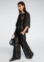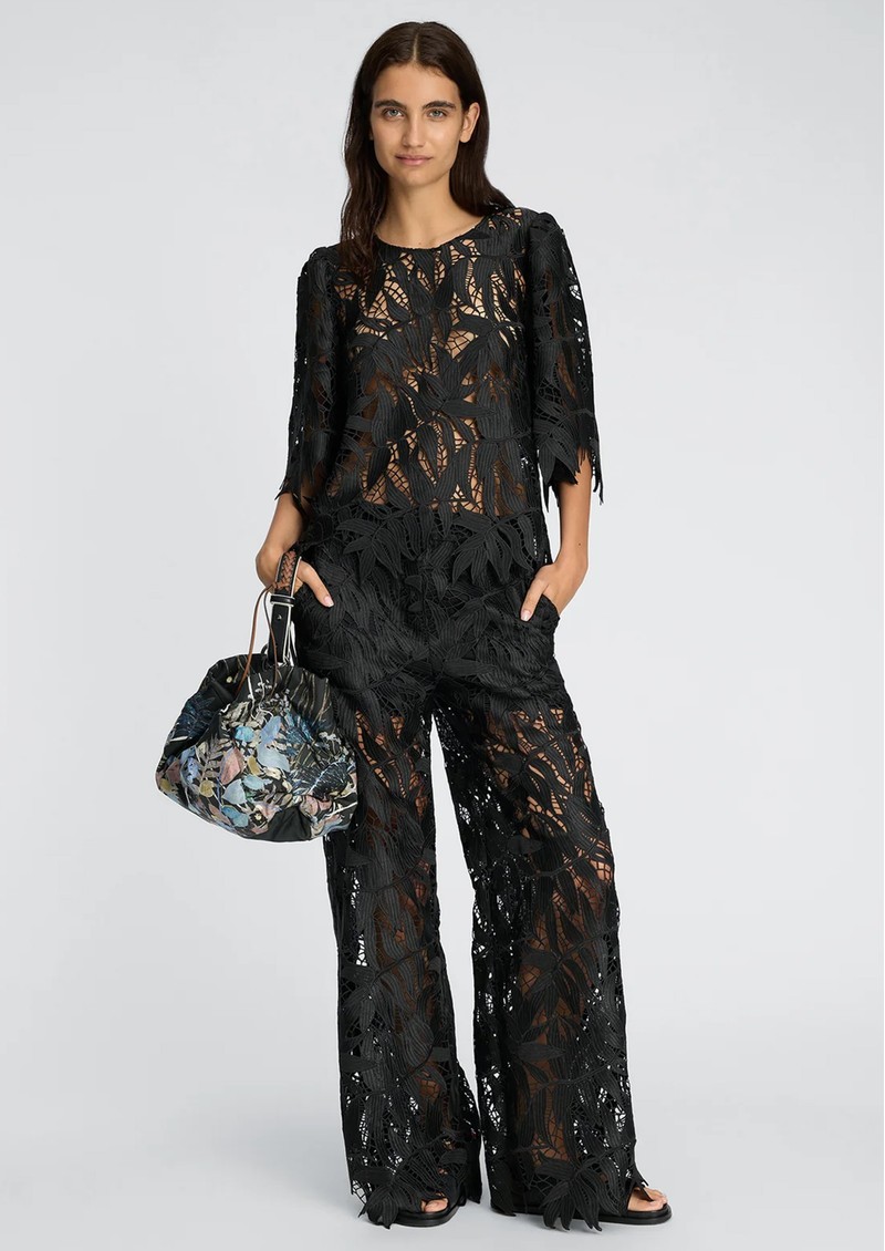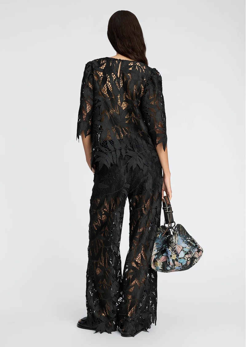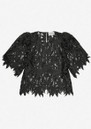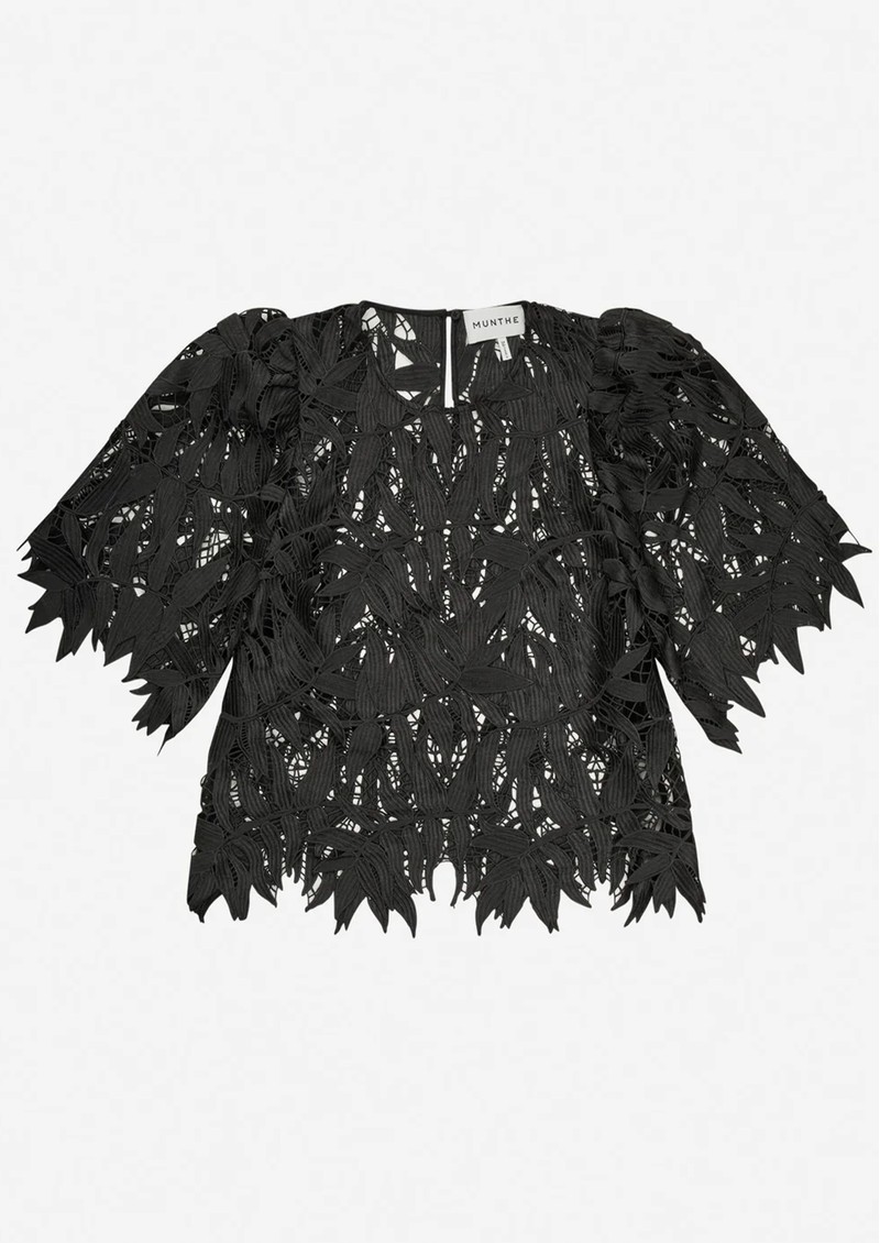 The Munthe Bubble Lace Top in black is an elegant statement piece, crafted from delicate leaf-shaped lace. Featuring short, voluminous sleeves, a classic round neckline, and a straight, relaxed fit, it offers a chic, semi-sheer finish for effortlessly stylish layering. Made from 100% polyester for a lightweight, wearable feel.