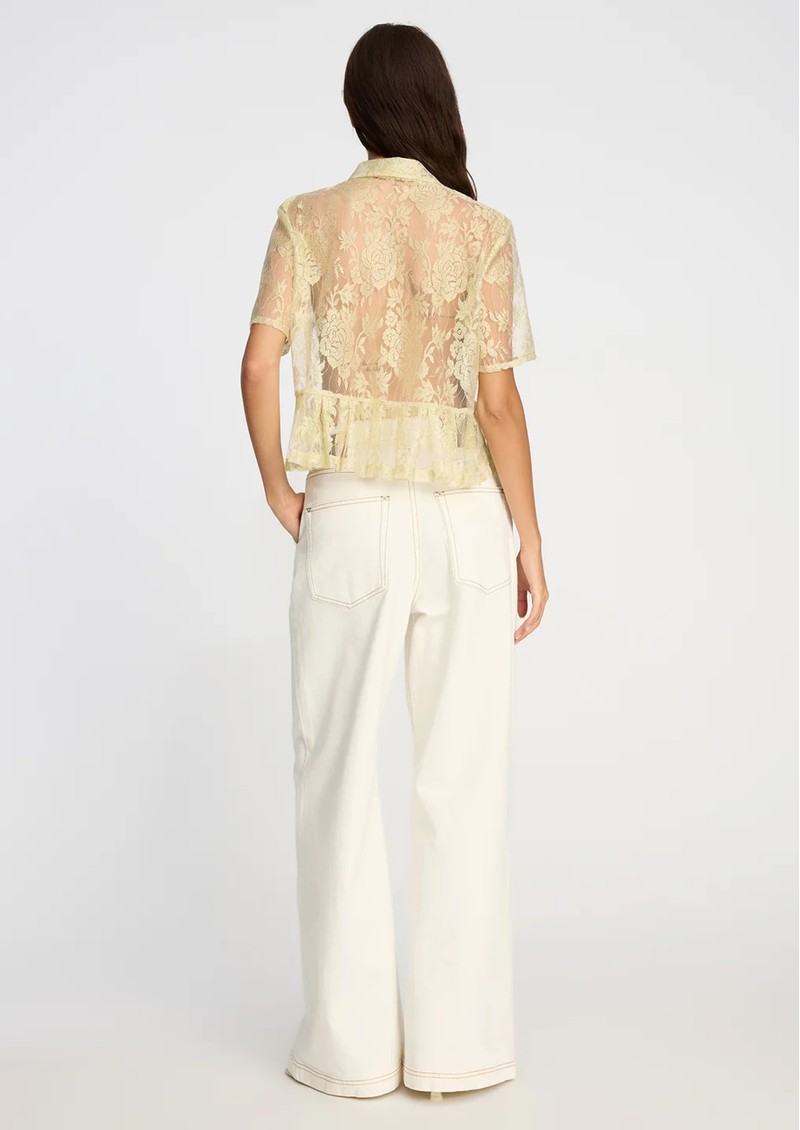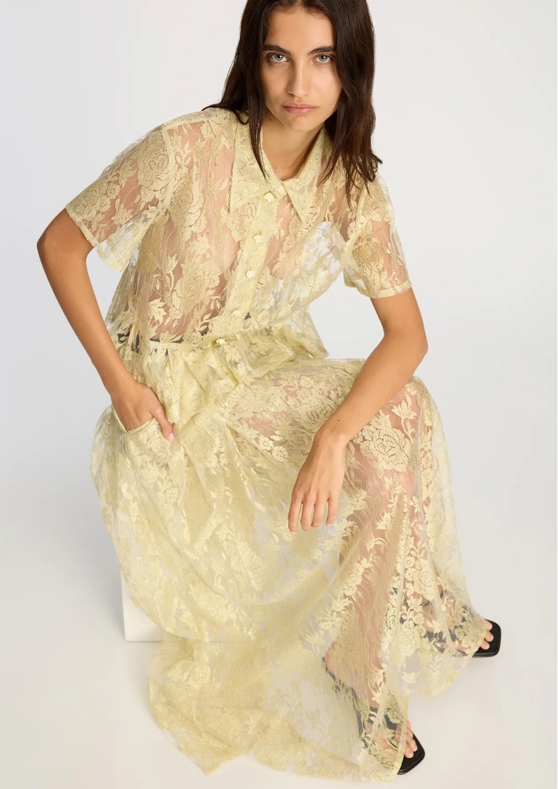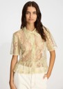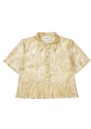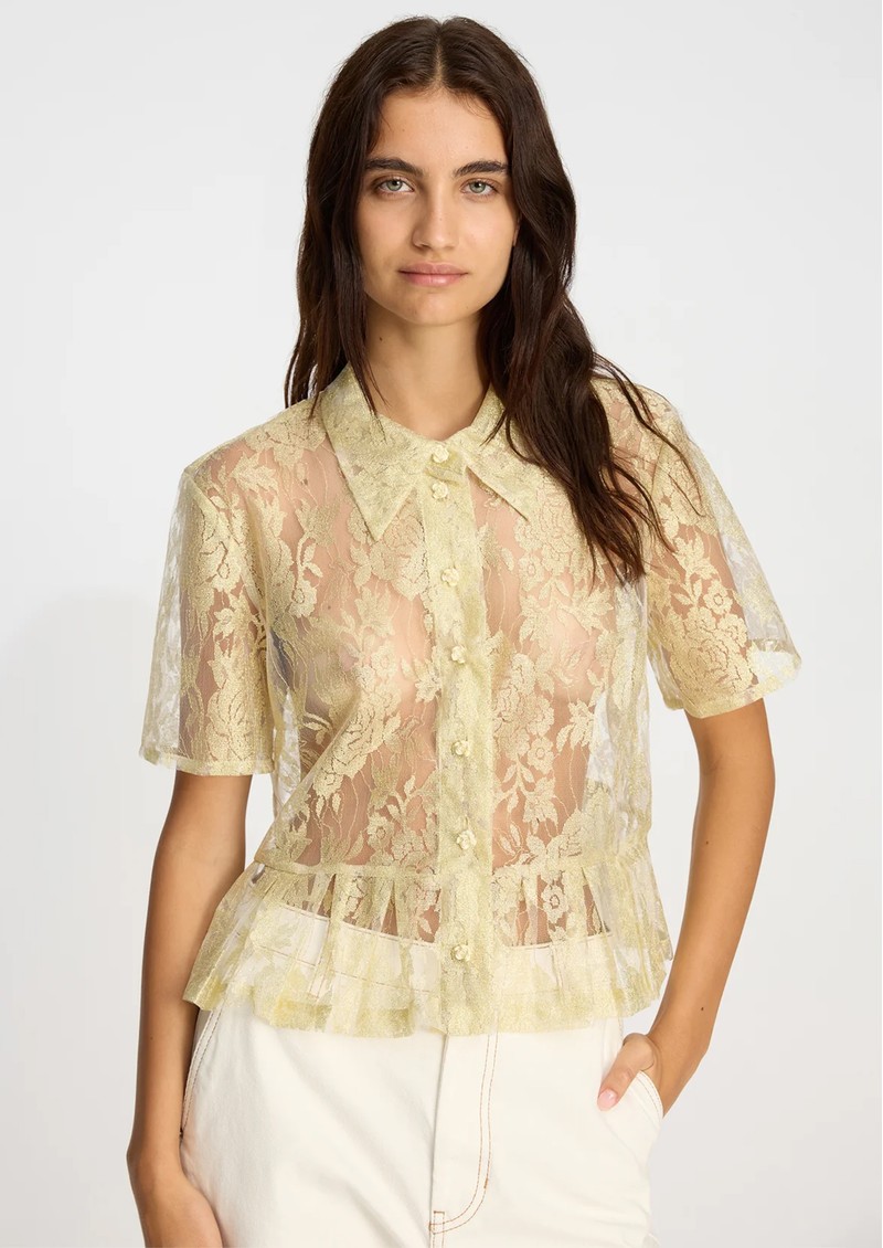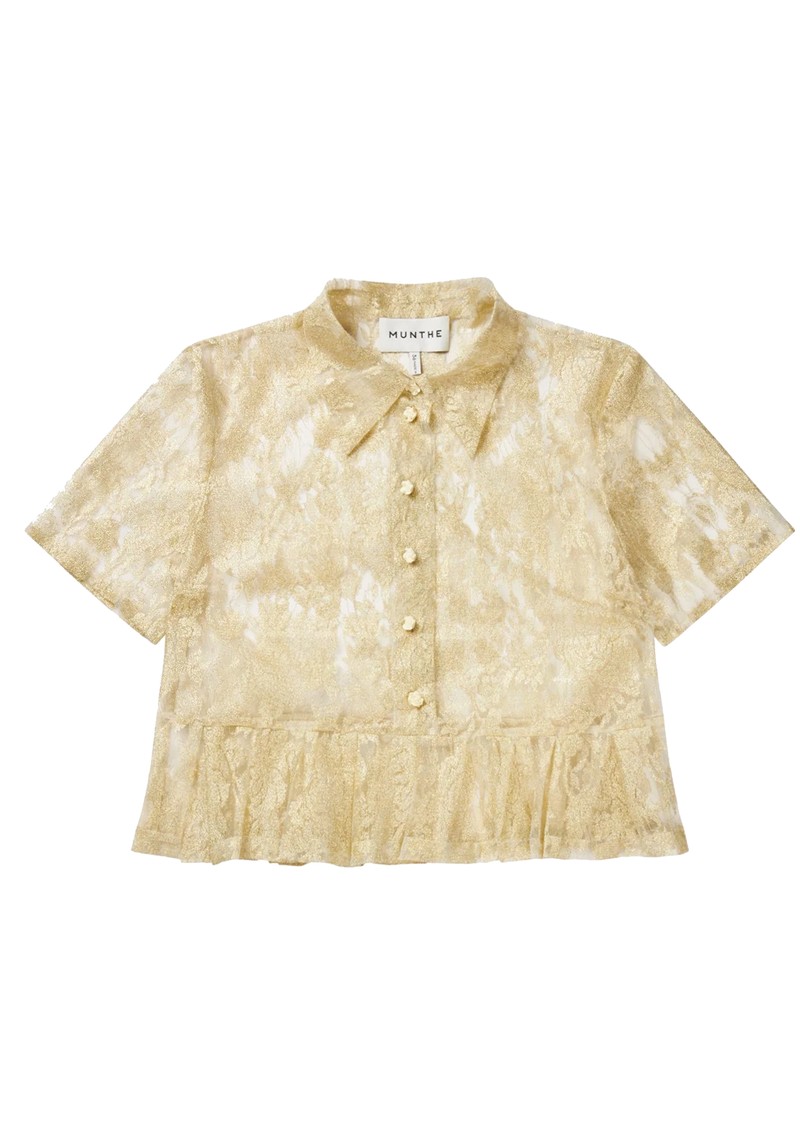 The Munthe Bustona Blouse in Gold is a sophisticated, statement piece crafted from gold-toned lace. Featuring a classic pointed collar, button fastening, short sleeves, and subtle peplum detailing at the hem, its sheer design adds an elegant, feminine touch.