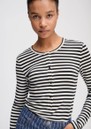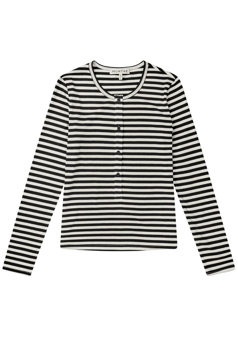 The Munthe Levoma is a soft, finely striped top that blends casual comfort with refined detailing. Featuring a sleek button closure, round neckline, and long sleeves, it’s the perfect fitted layer for styling under jackets or wearing solo for a chic, minimalist look.