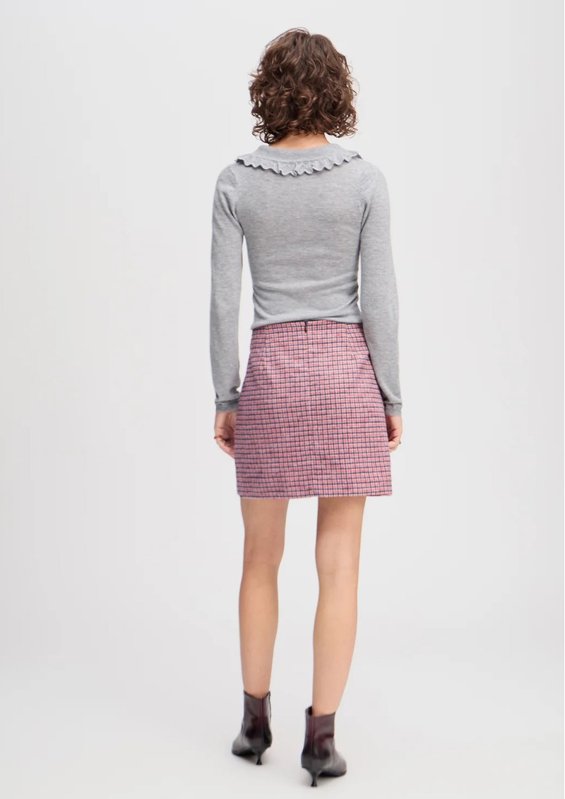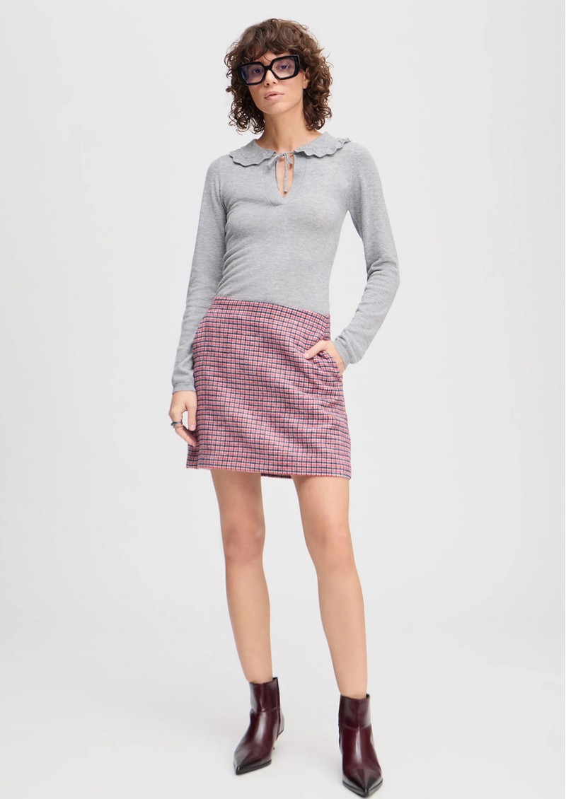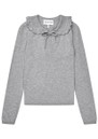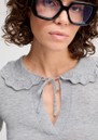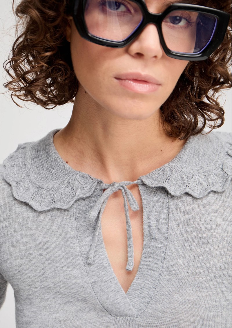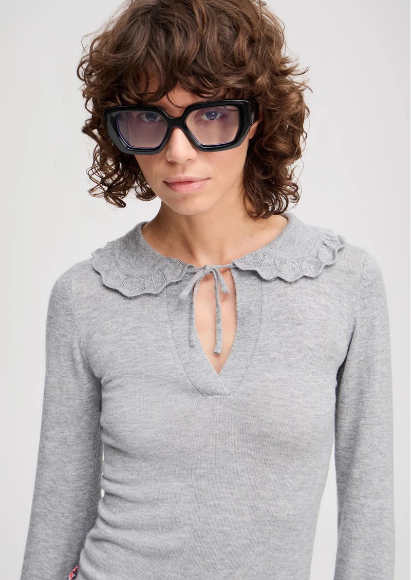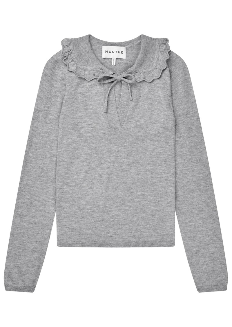 The Munthe Livo Knit Top is a fitted polo-style knit featuring an elegant frill sailor collar with a central tie closure, ribbed hemline, and wrist cuffs. Made from a soft wool blend in a gentle grey marl hue, it combines feminine detailing with a slim, flattering fit.