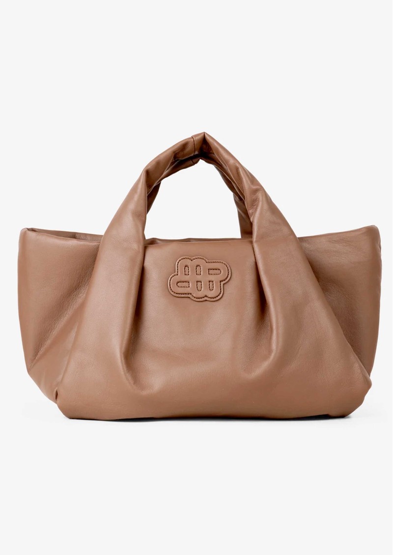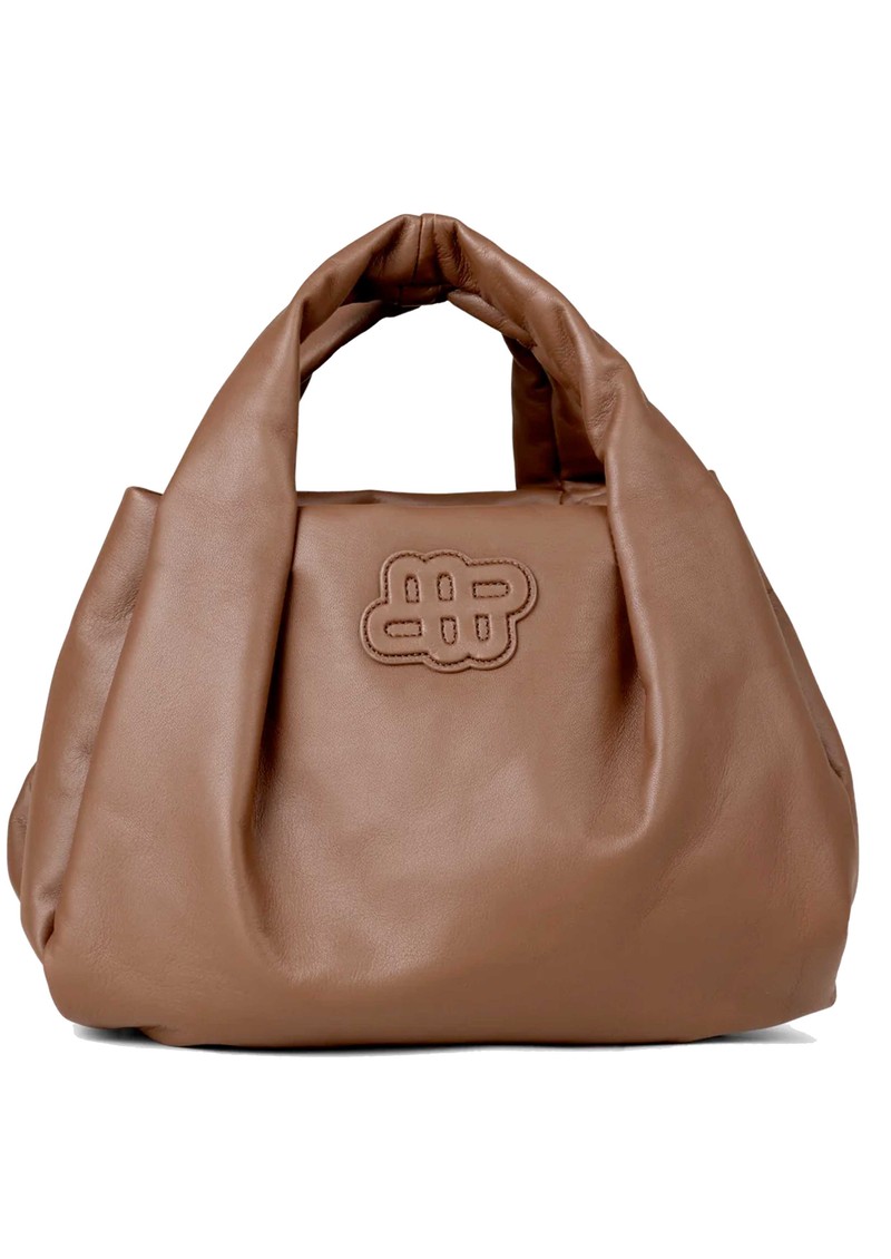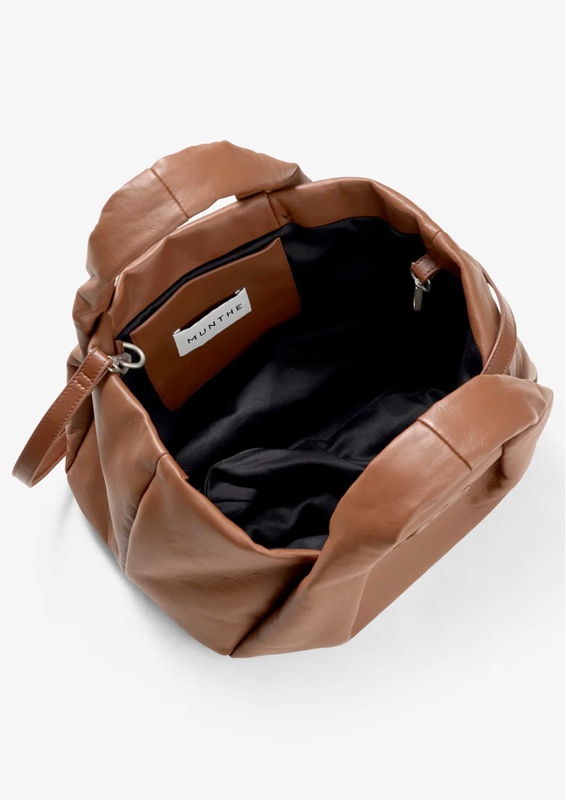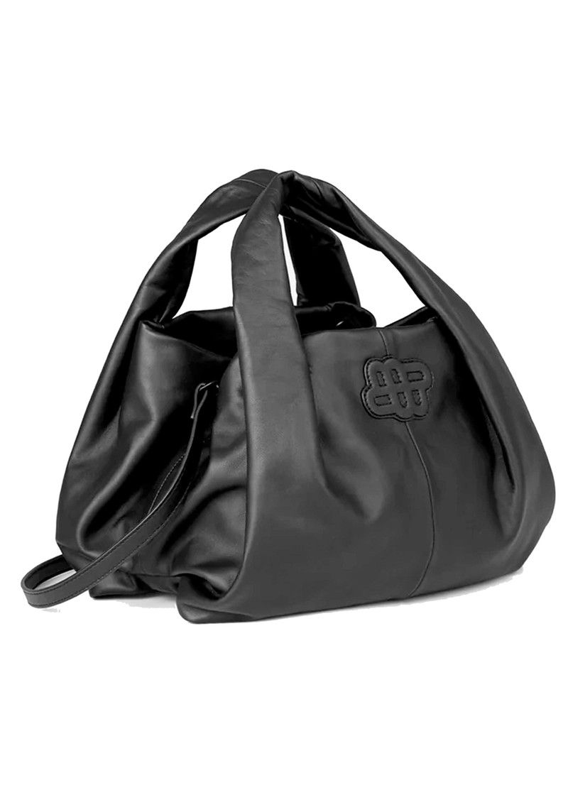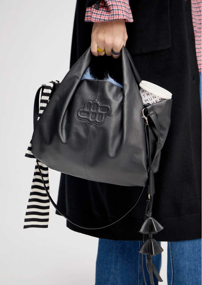 The Munthe Lix Leather Bag in Black is crafted from 100% soft lamb leather, featuring two elegant wide handles and a subtle MUNTHE emblem. Designed for versatility, it includes a detachable shoulder strap, a spacious main compartment, and a convenient inner side pocket.